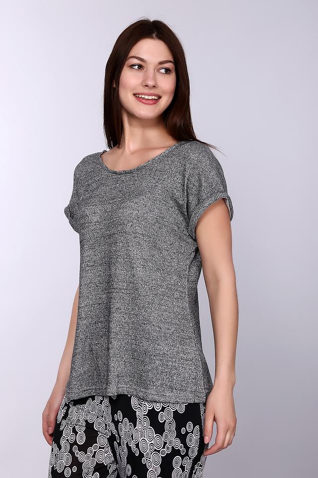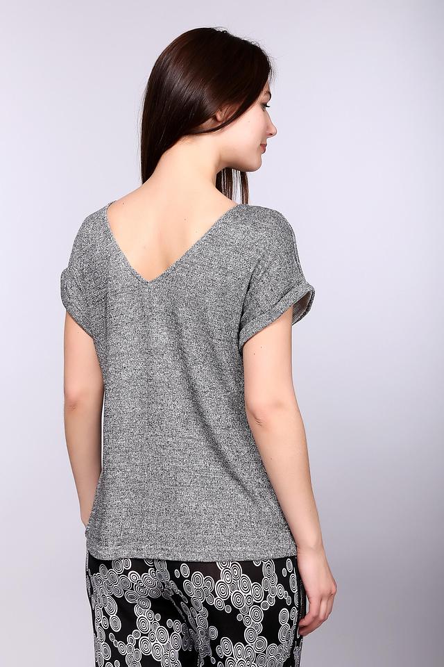 Модель имеет прямой крой, короткие рукава и округлый вырез горловины. Футболка изготовлена из смеси полиэстера, вискозы, металла и эластана, что обеспечивает комфорт при носке, хорошую посадку по фигуре и устойчивость к деформации.