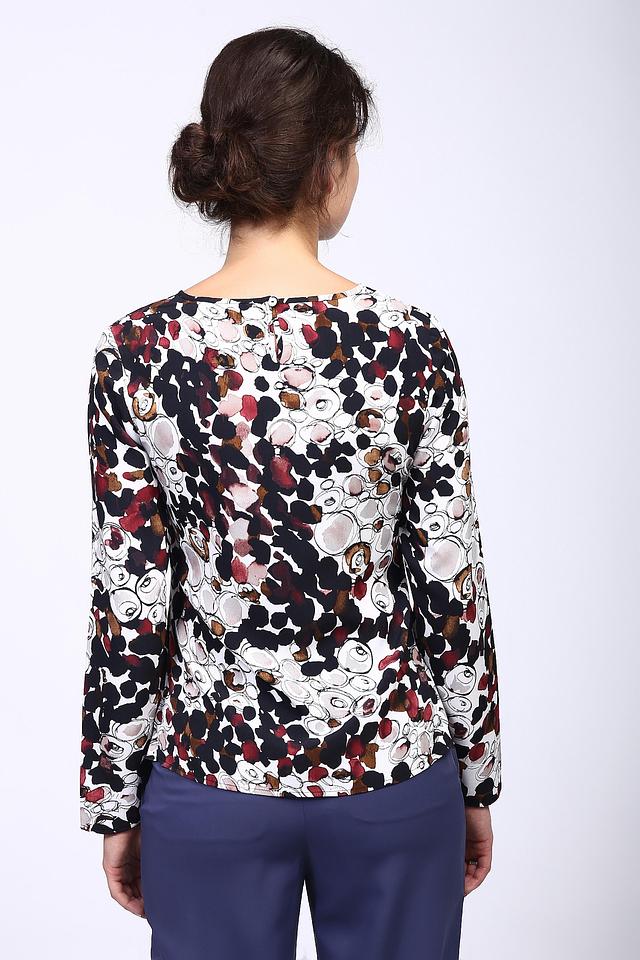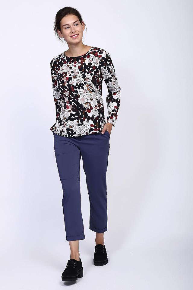 Модель имеет прямой крой, длинные рукава и круглый вырез горловины. Блуза изготовлена из 100% полиэстера, что обеспечивает ей лёгкость, мягкость и простоту в уходе.