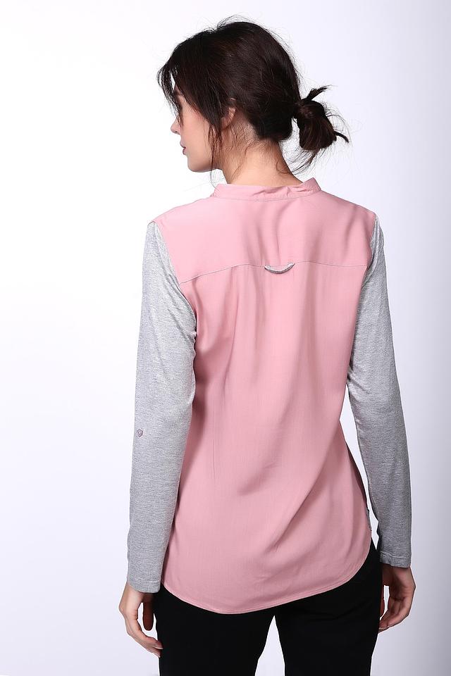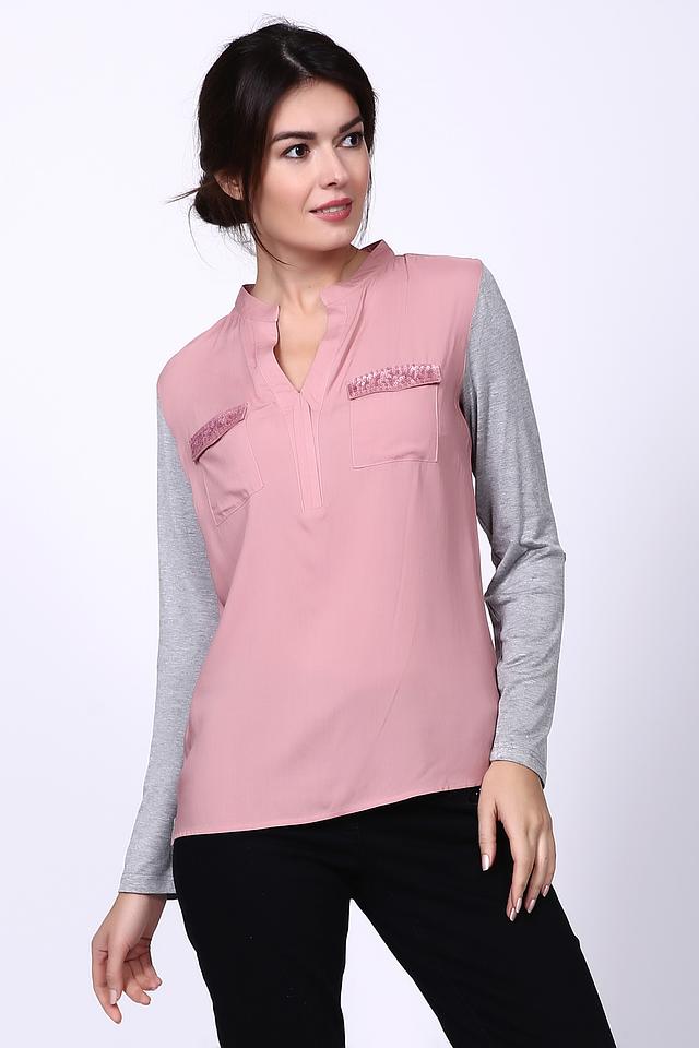 Модель имеет длинные рукава, выполненные из серого трикотажа, что создает интересный контраст с основной частью блузы нежно-розового цвета. V-образный вырез горловины придает образу женственности и легкости.