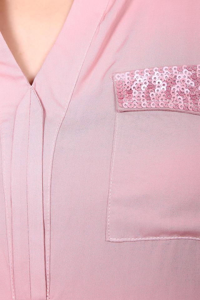 Розовая блуза Just Valeri с длинными рукавами и отделкой из пайеток. Модель выполнена из вискозы, имеет V-образный вырез и декоративный карман с пайетками. Состав: вискоза 100%, Состав_отделка вискоза 95%, Состав_отделка эластан 5%