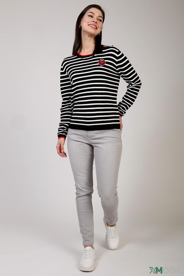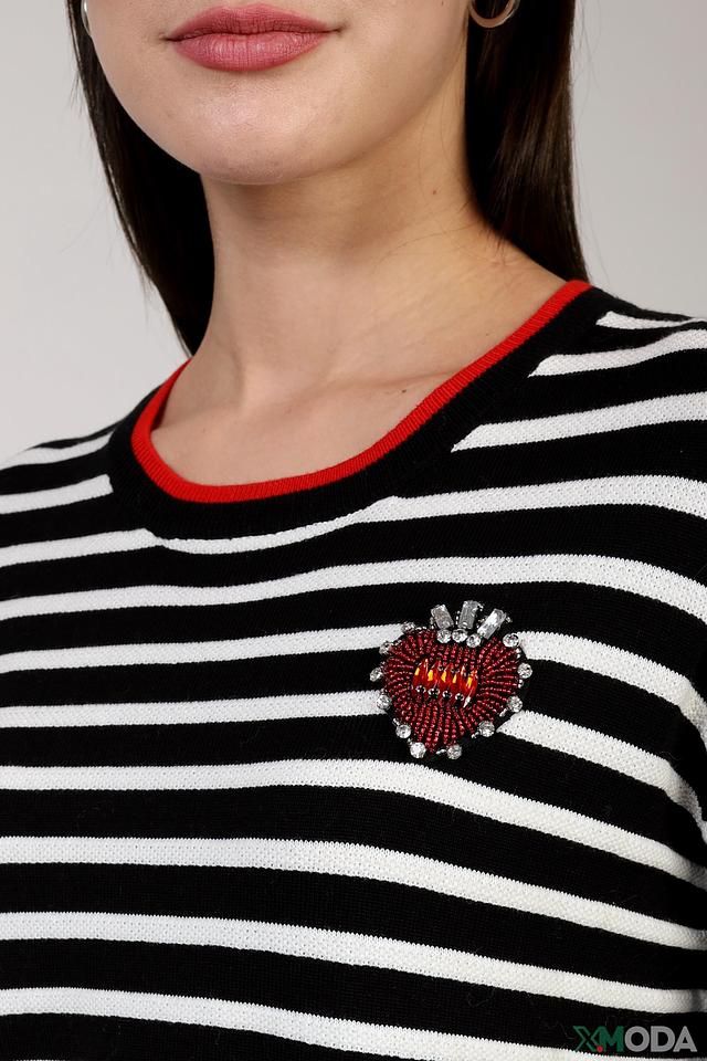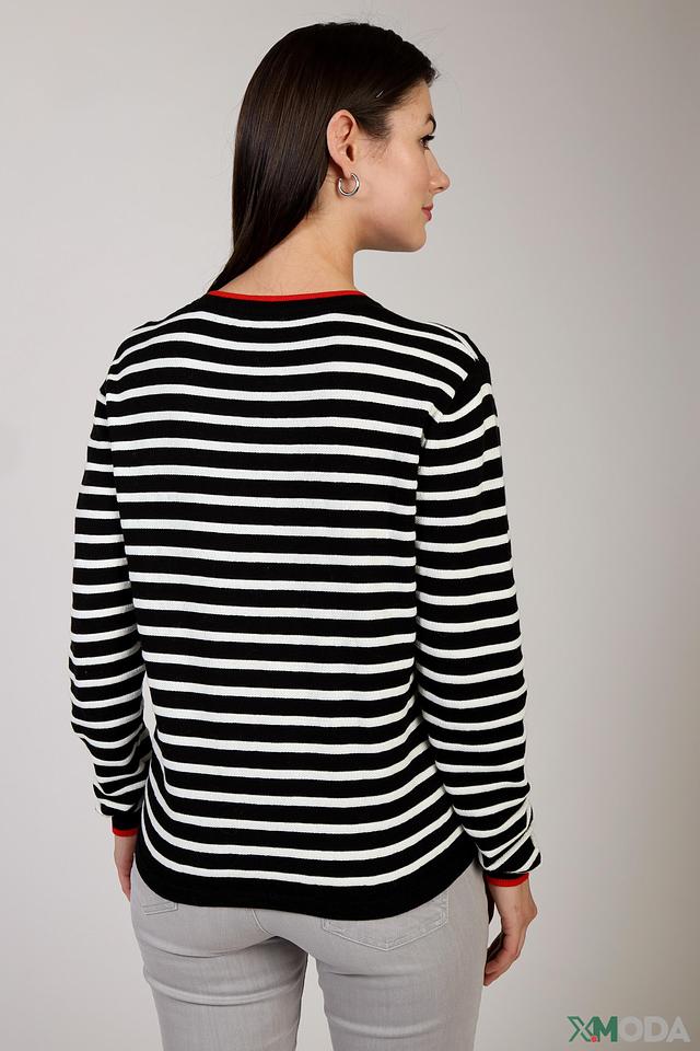 Женский пуловер Just Valeri чёрно-белого цвета с полоской и декоративной брошью. Модель выполнена из мягкого и приятного к телу сочетания хлопка и акрила, обеспечивая комфорт в носке. Состав: хлопок 55%, акрил 45%