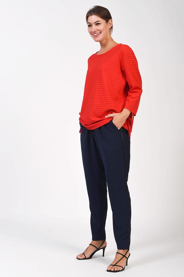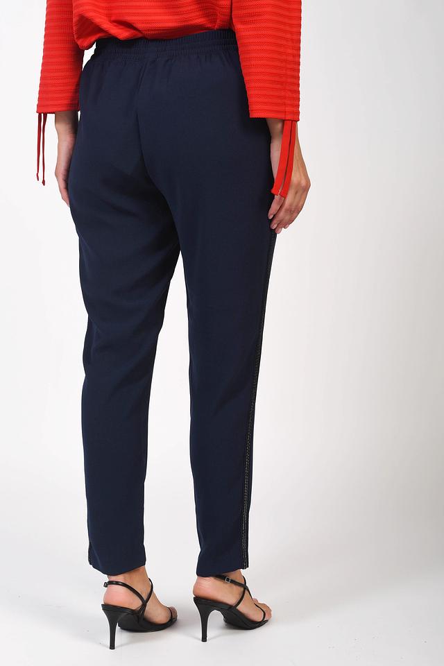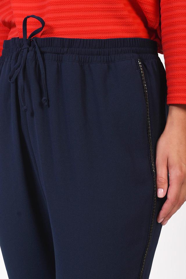 Брюки имеют прямой крой и эластичный пояс с кулиской, что обеспечивает комфортную посадку по фигуре. Декоративная полоса по боковому шву добавляет образу изысканности и оригинальности.