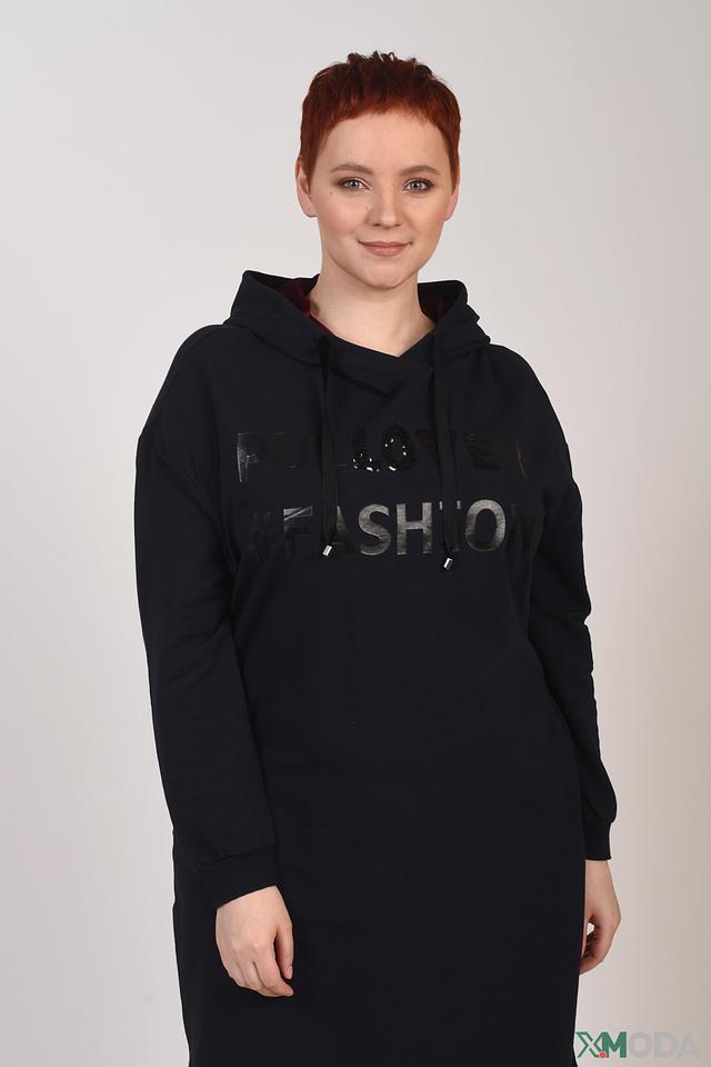 Модель имеет свободный крой, капюшон и длинные рукава. На передней части платья размещена надпись "I LOVE FASHION", выполненная в контрастном цвете. Платье изготовлено из мягкого и приятного к телу трикотажа, в составе которого полиэстер, хлопок, модал и спандекс.