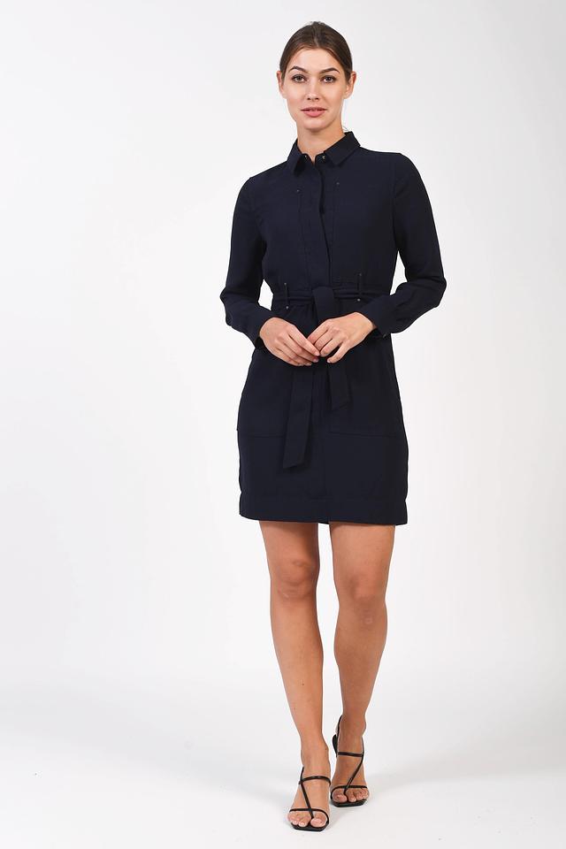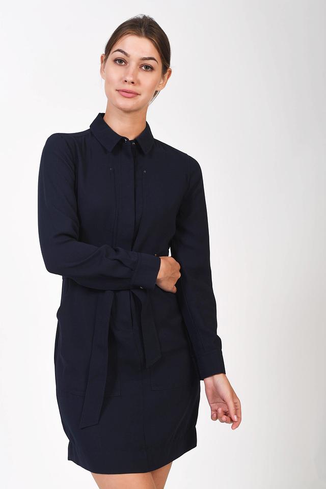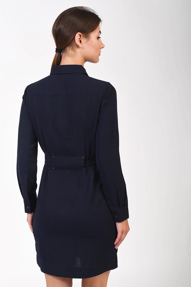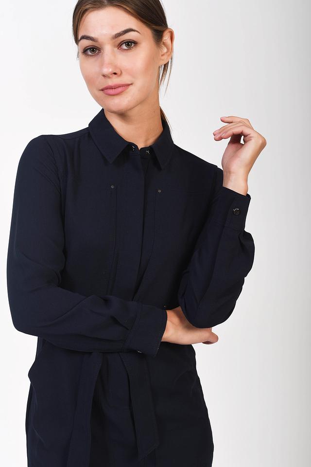 Платье-рубашка от Just Valeri темно-синего цвета выполнено из гладкого полиэстера. Модель с длинным рукавом и поясом подчеркнет талию и создаст элегантный образ. Состав: полиэстер 100%