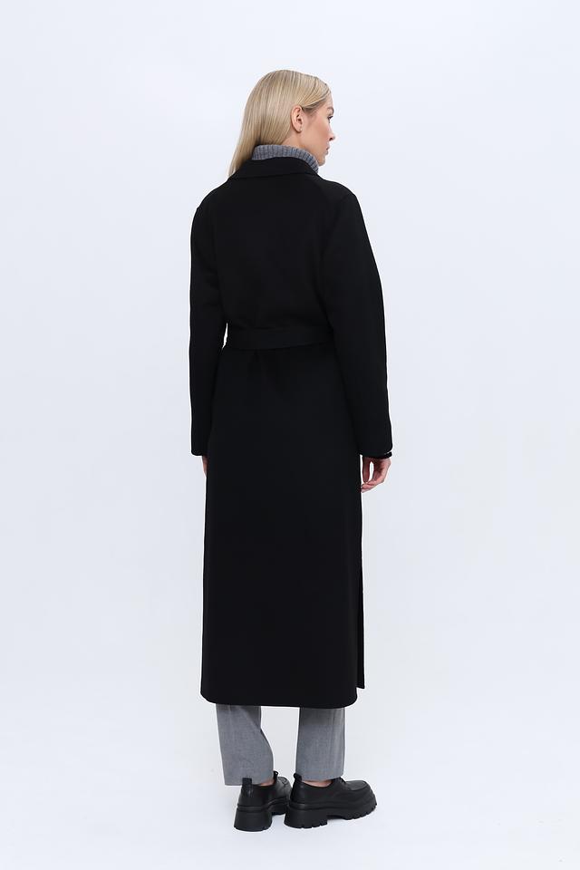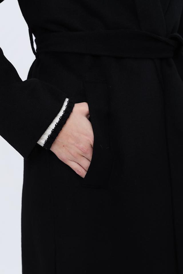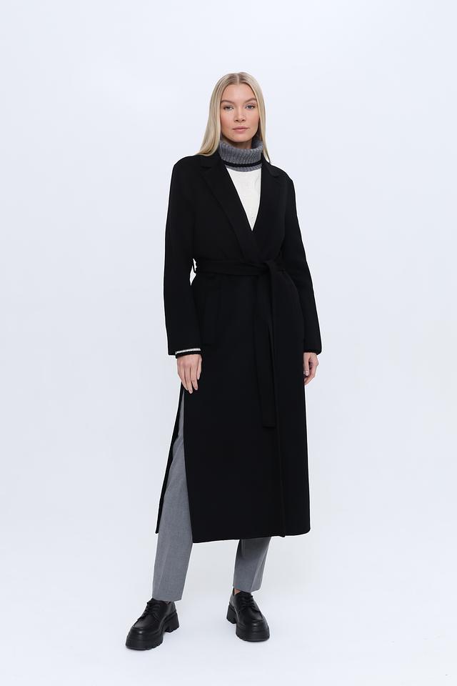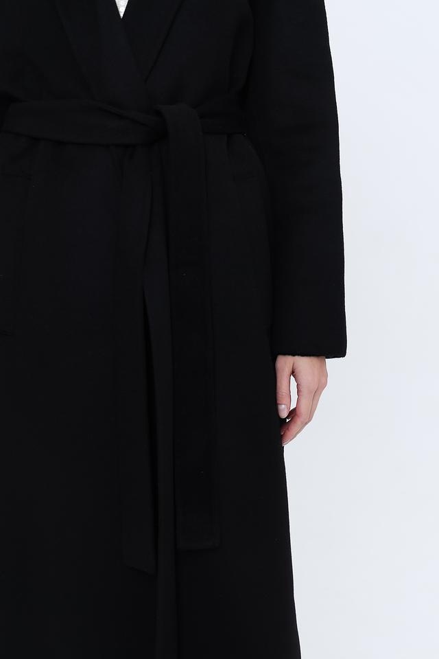 Модель имеет V-образный вырез, застегивается на пояс, что позволяет регулировать посадку по фигуре. Длинные рукава дополнены аккуратной отделкой. Пальто идеально подойдет для повседневной носки и особых случаев.