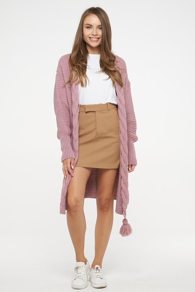 Особенностью данной модели является крупная вязка и декоративные кисти по бокам. Длинные рукава и удлиненный силуэт позволяют создавать разнообразные образы – от повседневных до более элегантных. Кардиган застегивается на пуговицы, что позволяет регулировать степень открытости.