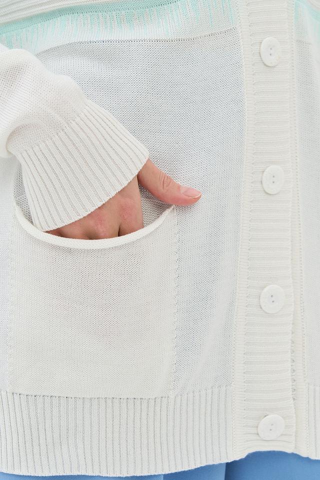 Кардиган застегивается на ряд пуговиц, что позволяет регулировать степень открытости. Два удобных кармана добавляют функциональности и практичности. Изделие выполнено из приятного на ощупь трикотажа, в составе которого 50% вискоза, 30% полиэстер и 20% хлопок.