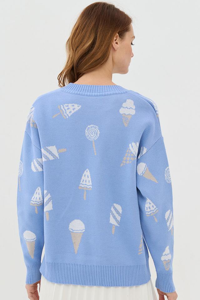 Этот стильный кардиган от BE YOU выполнен в нежном голубом цвете и украшен забавным принтом в виде мороженого. Модель имеет V-образный вырез и застегивается на пуговицы по всей длине.