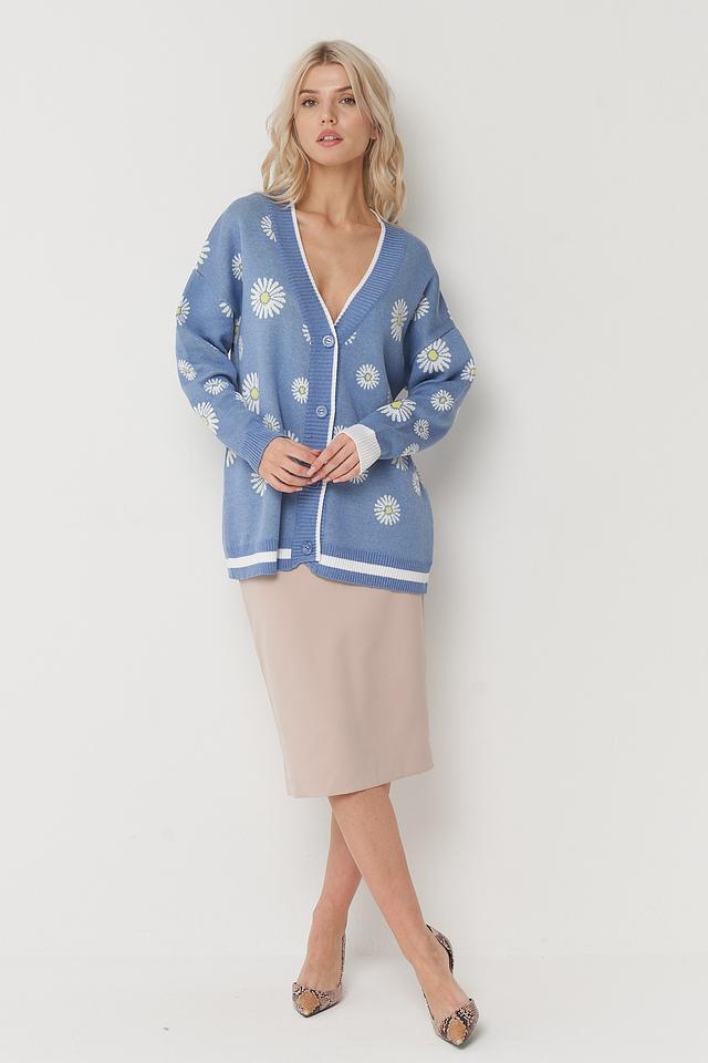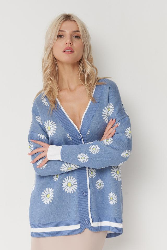 Представляем вашему вниманию стильный кардиган от бренда BE YOU. Эта модель выполнена в нежном голубом цвете и украшена очаровательным узором из ромашек, что придает ей романтичный и женственный вид.