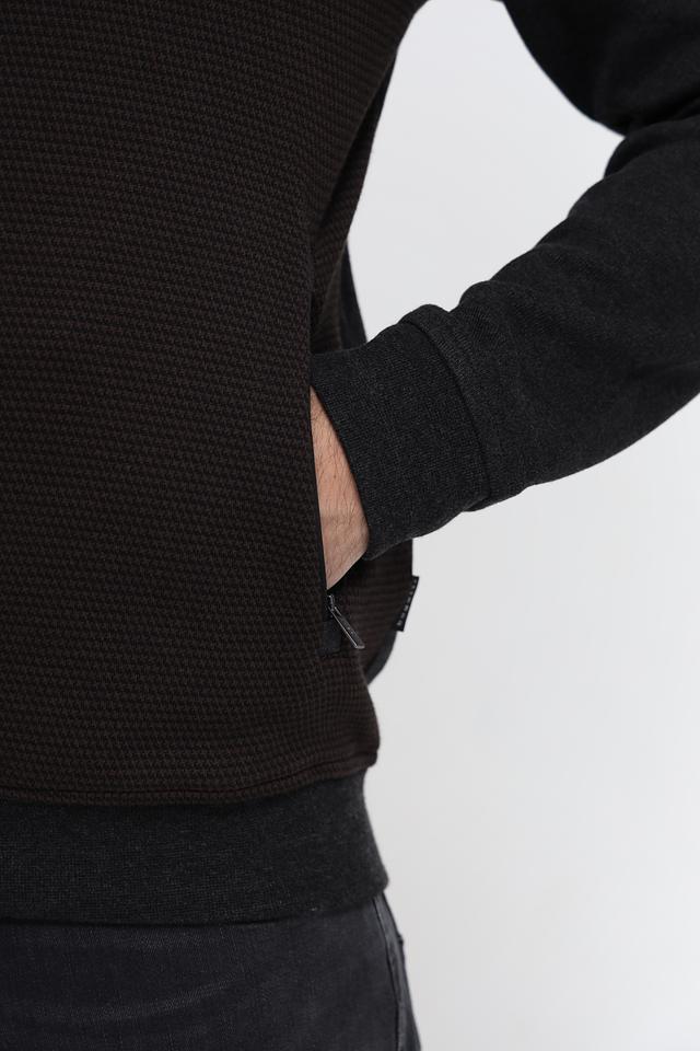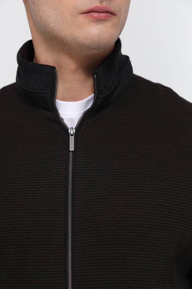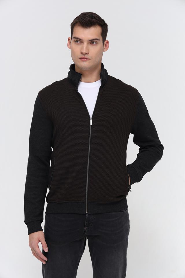 Мужской кардиган Bugatti чёрного цвета с контрастными деталями и застёжкой на молнию. Изготовлен из фактурного трикотажа, имеет воротник-стойку и удобные боковые карманы. Состав: хлопок 100%