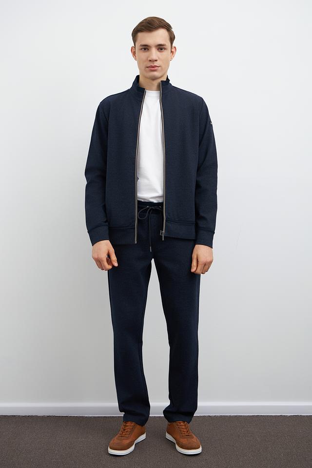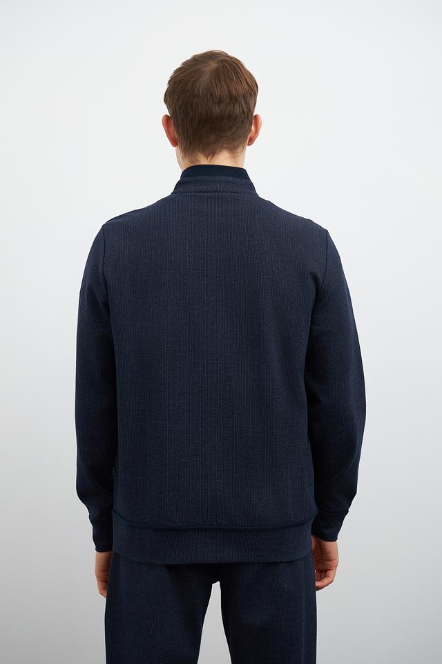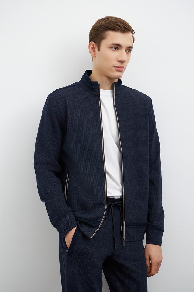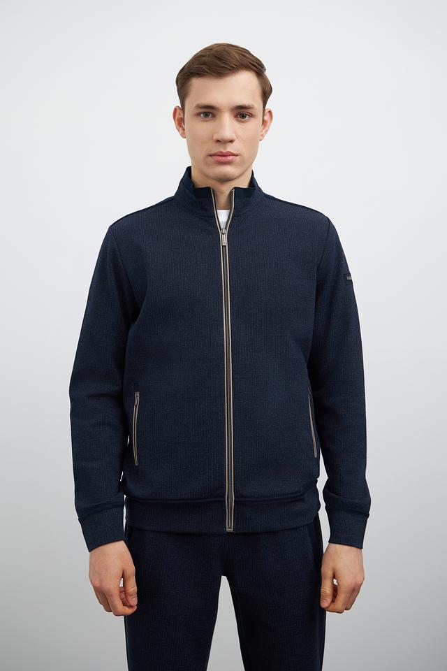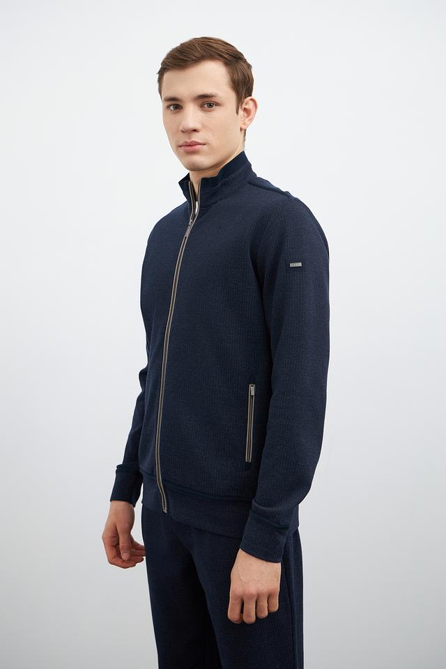 Мужской кардиган Bugatti тёмно-синего цвета с текстурной поверхностью и золотистой молнией. Изготовлен из хлопка с добавлением полиэстера и эластана для комфорта и износостойкости. Состав: хлопок 47%, полиэстер 47%, эластан 6%