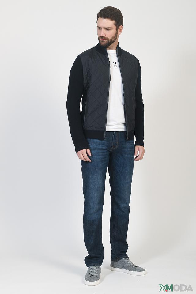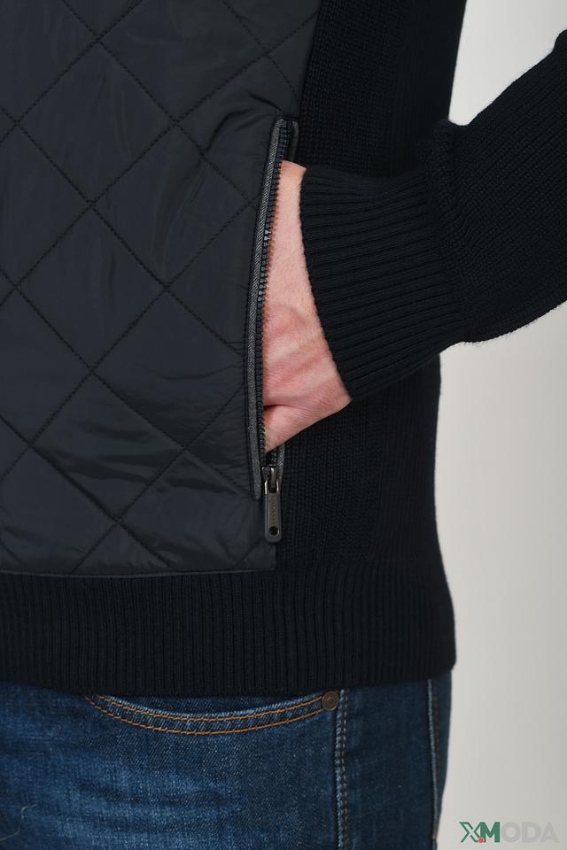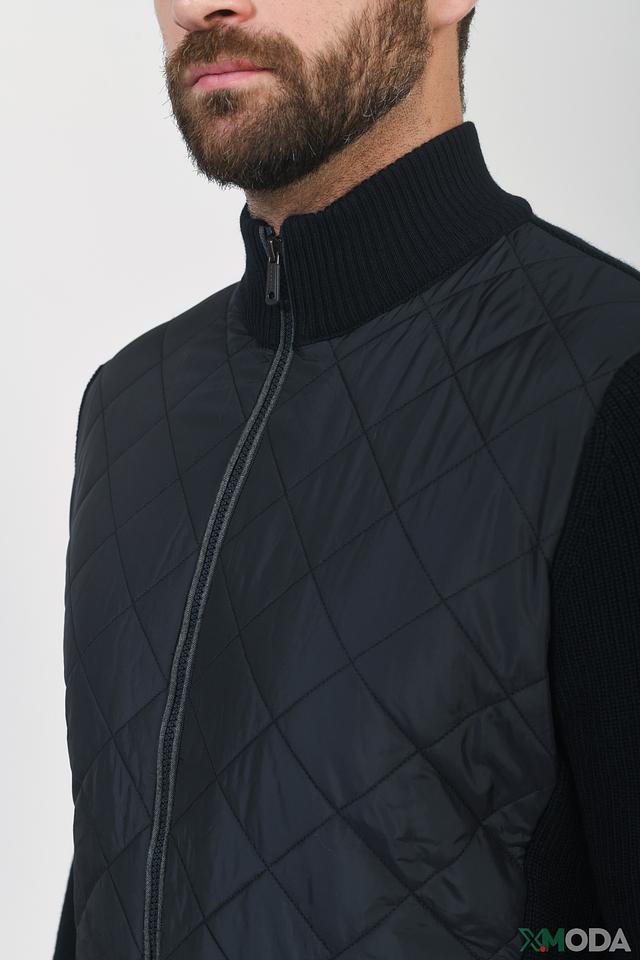 Передняя часть кардигана и плечи оформлены стеганой тканью, что придает изделию оригинальный вид и дополнительную теплоизоляцию. Рукава и спинка выполнены из гладкого трикотажа. Застежка – молния, воротник – стойка.