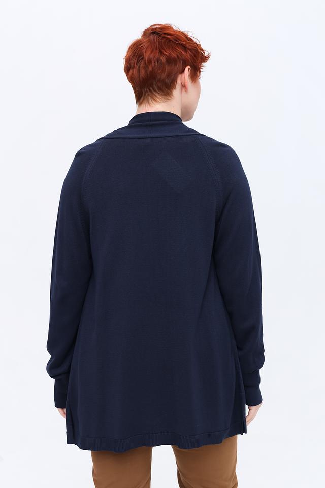 Модель имеет прямой крой, длинные рукава и открытую конструкцию без застежек. На передней части кардигана расположены два удобных кармана. Классический дизайн делает этот кардиган универсальным элементом гардероба, подходящим для повседневной носки.