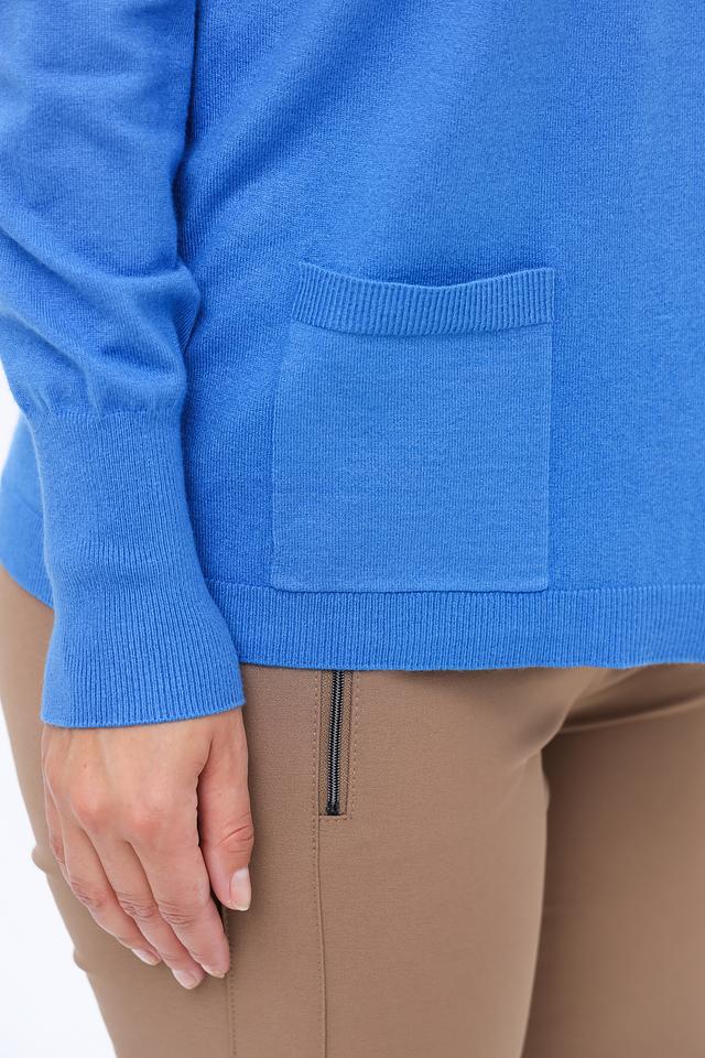 Модель имеет прямой крой, длинные рукава и открытую конструкцию без застежек. Два удобных кармана расположены на передней части кардигана. Голубой цвет изделия придаёт ему свежий и современный вид.
