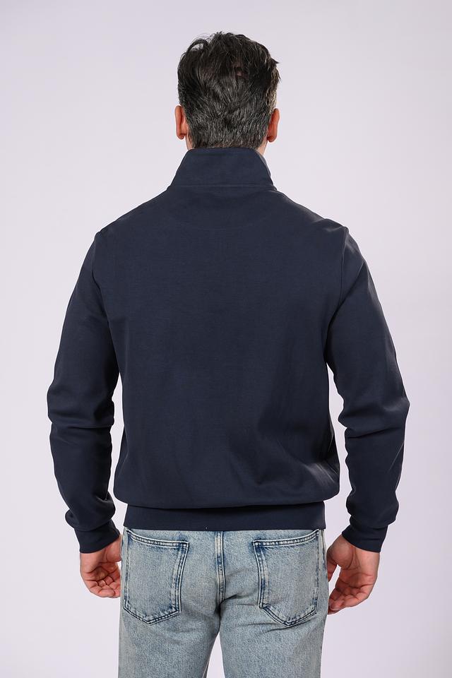 Кардиган имеет тёмно-синий цвет, который легко сочетается с различными элементами одежды. Застёжка-молния позволяет регулировать степень тепла и создавать разные образы. На груди расположен небольшой логотип бренда, добавляющий изделию узнаваемость.