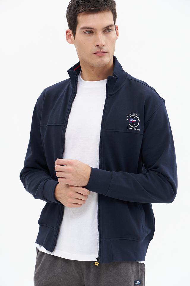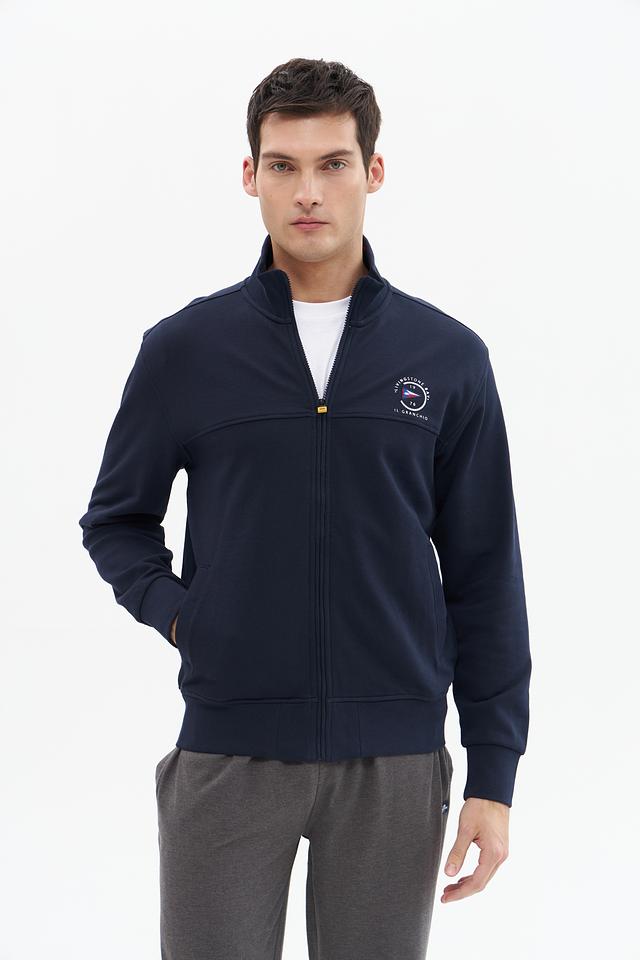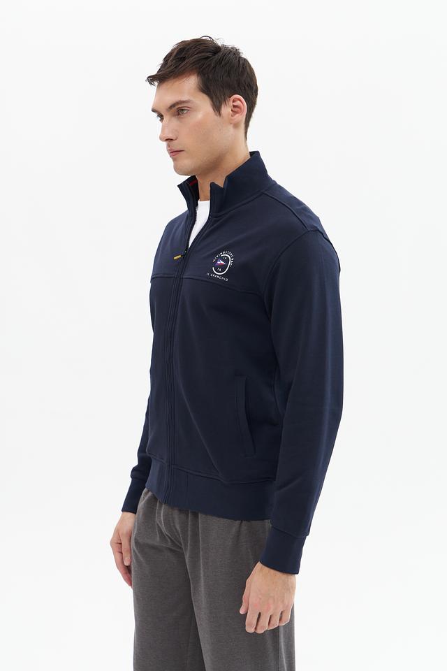 Мужской кардиган от бренда Granchio выполнен в классическом синем цвете. Модель имеет удобную застежку-молнию и круглый вырез горловины.