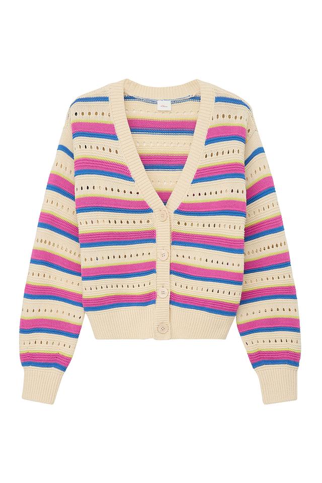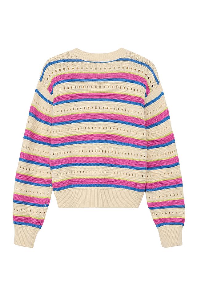 Кардиган имеет классический силуэт с V-образным вырезом и застежкой на пуговицы. Яркий полосатый узор, выполненный в различных оттенках, придает изделию игривый и жизнерадостный вид. Бежевый фон гармонично сочетается с разноцветными полосами, создавая стильный и запоминающийся образ.