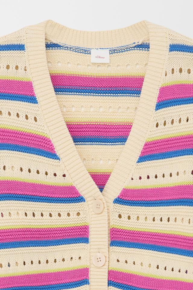 Детский кардиган s.Oliver бежевого цвета с ярким полосатым узором. Модель выполнена из мягкого хлопкового трикотажа и застегивается на пуговицы. Уютный и стильный вариант для прохладной погоды. Состав: хлопок 50%, полиакрил 50%