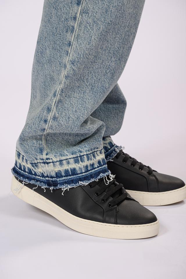 Джинсы имеют классический прямой крой, обеспечивающий свободу движений и комфортную посадку. Необработанный низ брюк добавляет образу непринужденности и современности.