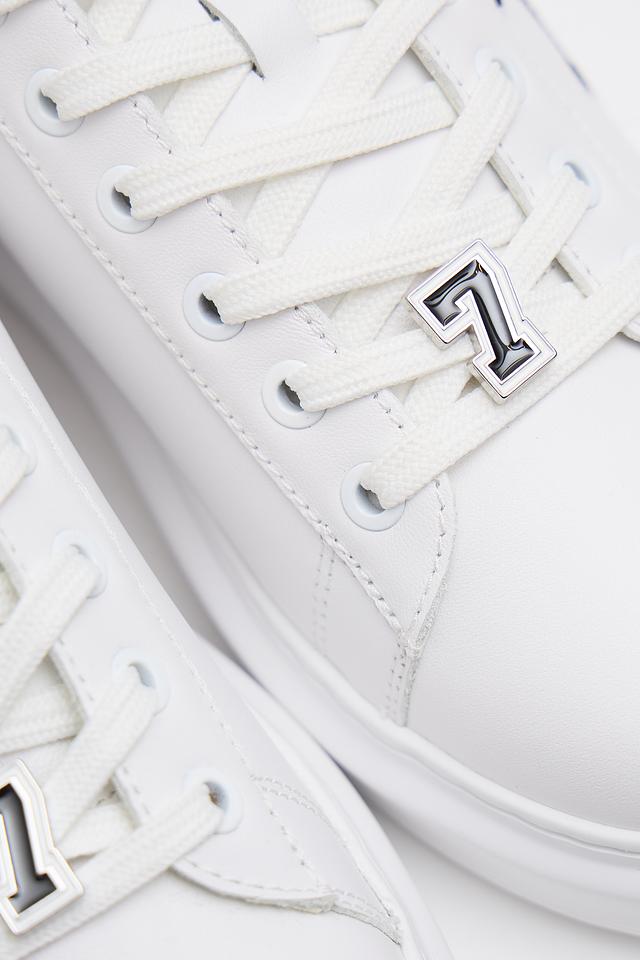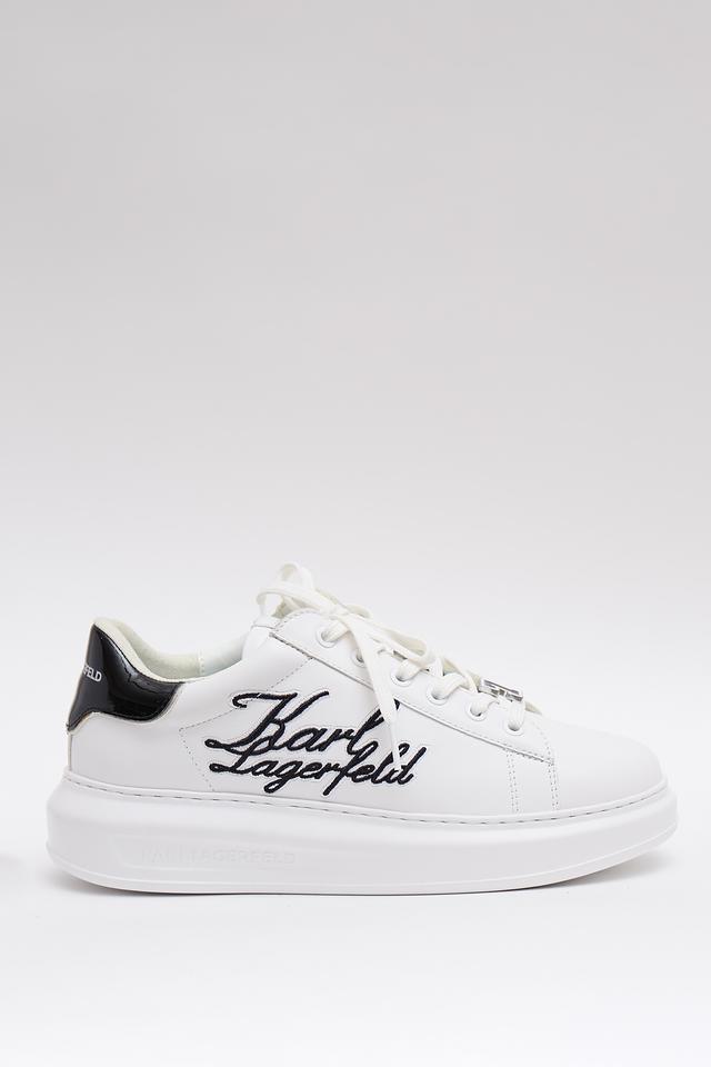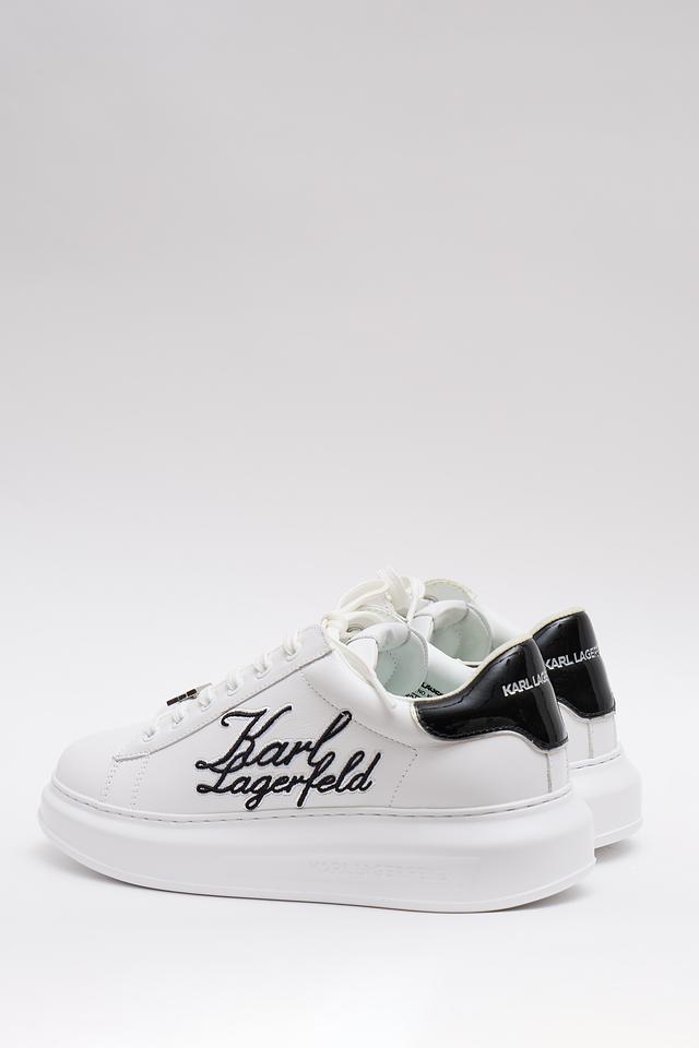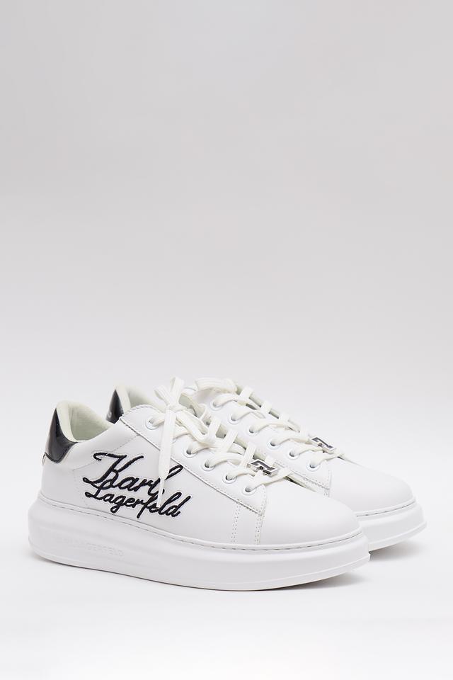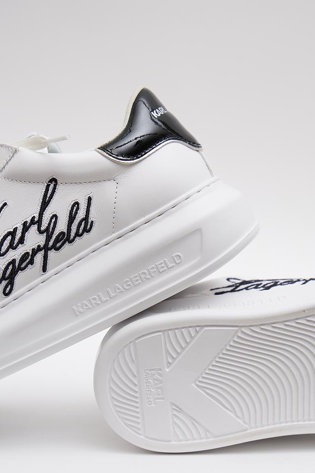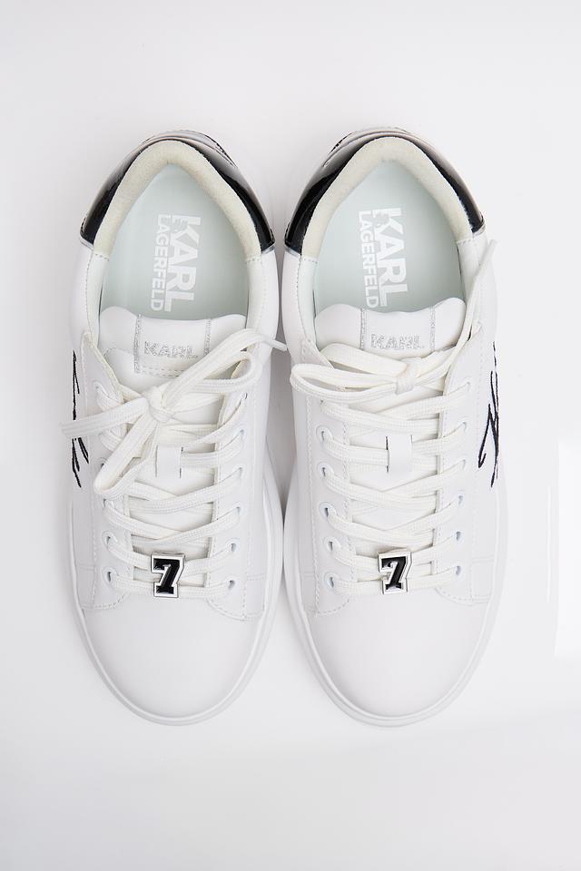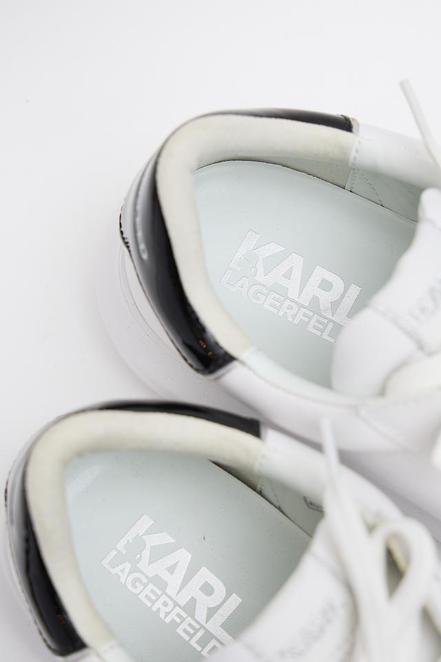 Верх кроссовок изготовлен из высококачественной кожи, что обеспечивает долговечность и комфорт при носке. Фирменный логотип Karl Lagerfeld, выполненный в черном цвете, эффектно выделяется на белом фоне, придавая обуви особый шарм.