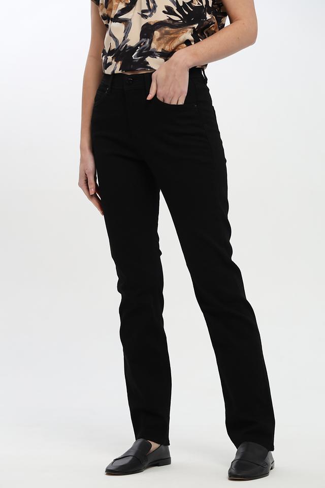 Джинсы имеют прямой крой, который обеспечивает комфортную посадку по фигуре и не сковывает движений. Высокая посадка визуально удлиняет ноги и подчеркивает талию. Застёжка на молнию и пуговицу.