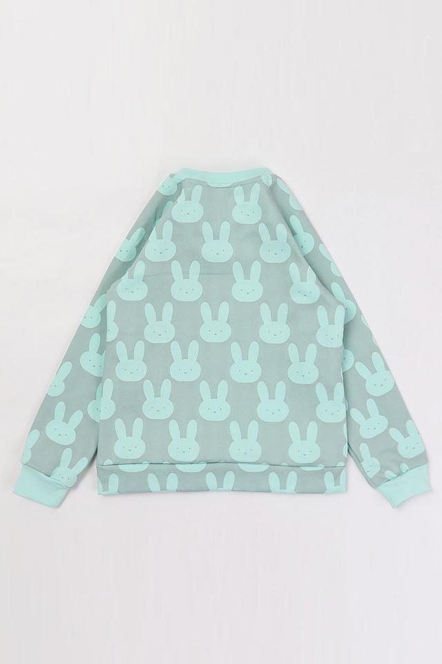 Джемпер имеет мятный цвет и украшен забавным принтом с изображением белых зайчиков. Округлый вырез горловины и длинные рукава обеспечивают комфортную посадку. Мягкая ткань не сковывает движения, позволяя ребёнку свободно играть и заниматься своими делами.