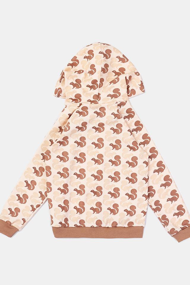 Кардиган имеет бежевый цвет и украшен милым принтом с изображением белок. Застёжка-молния позволяет легко надевать и снимать кардиган, а капюшон защитит от ветра и прохлады.