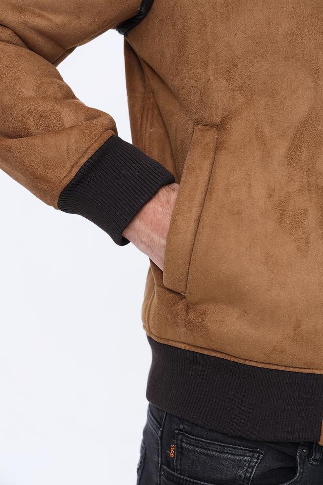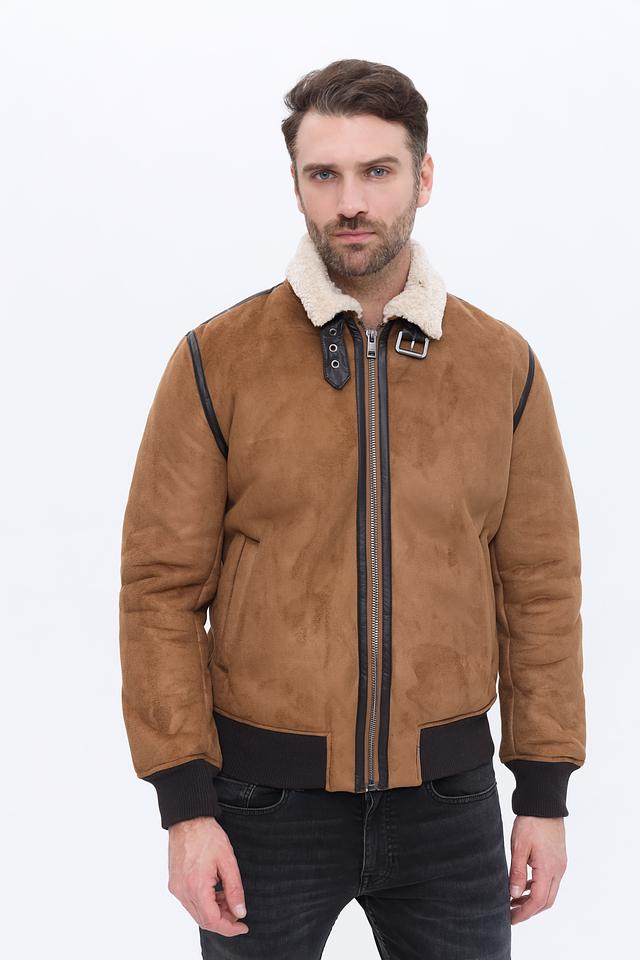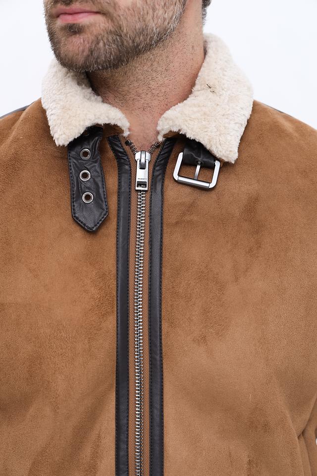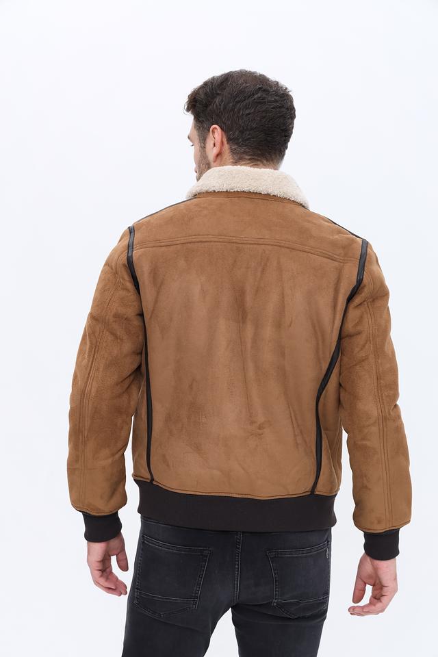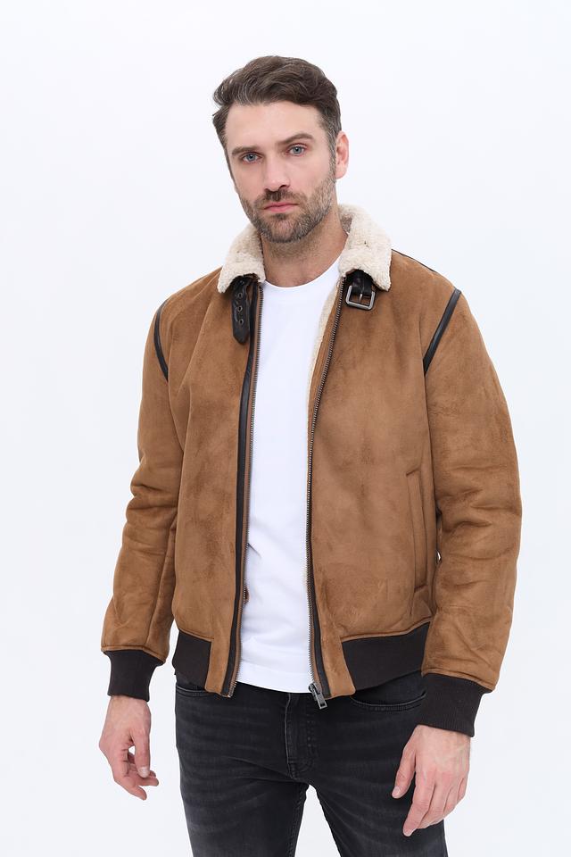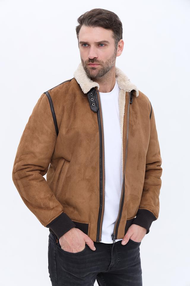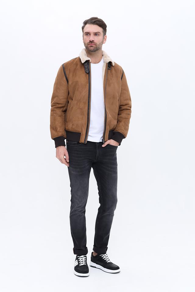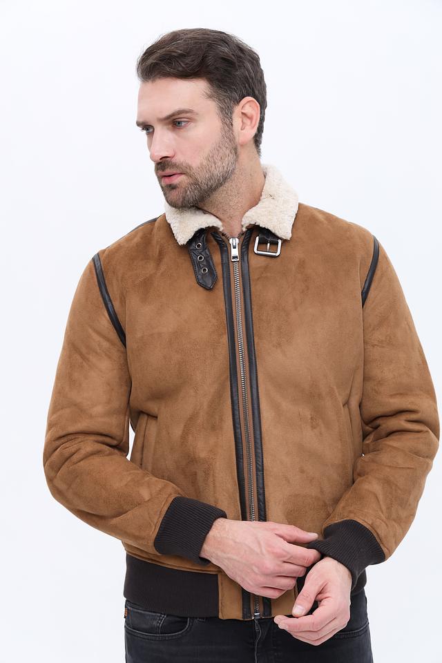 Куртка имеет классический коричневый цвет и стильный дизайн с меховым воротником. Застежка на молнии обеспечивает удобство и надежность. Декоративные элементы в виде кожаных вставок добавляют куртке изысканности.