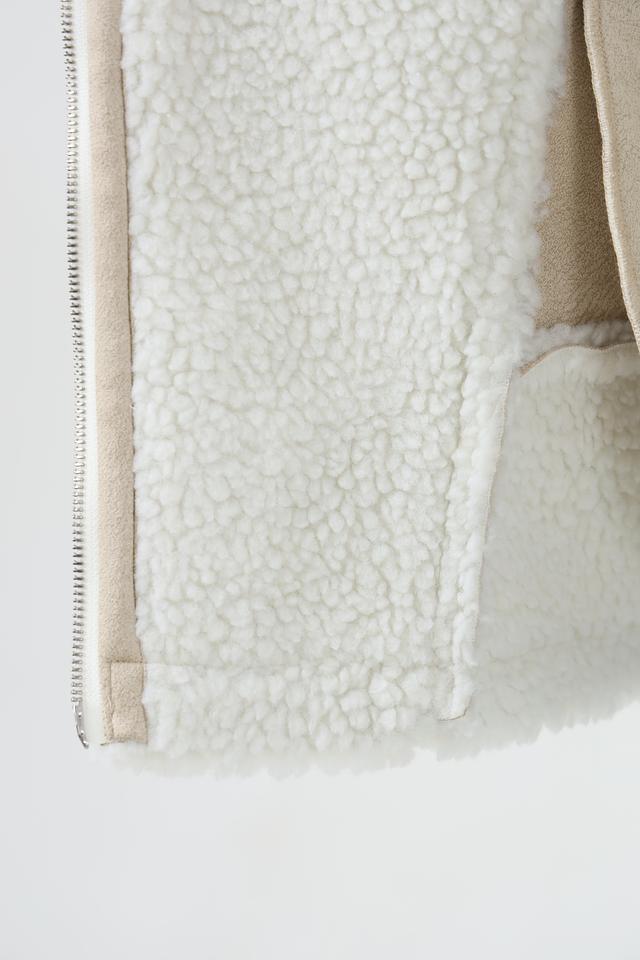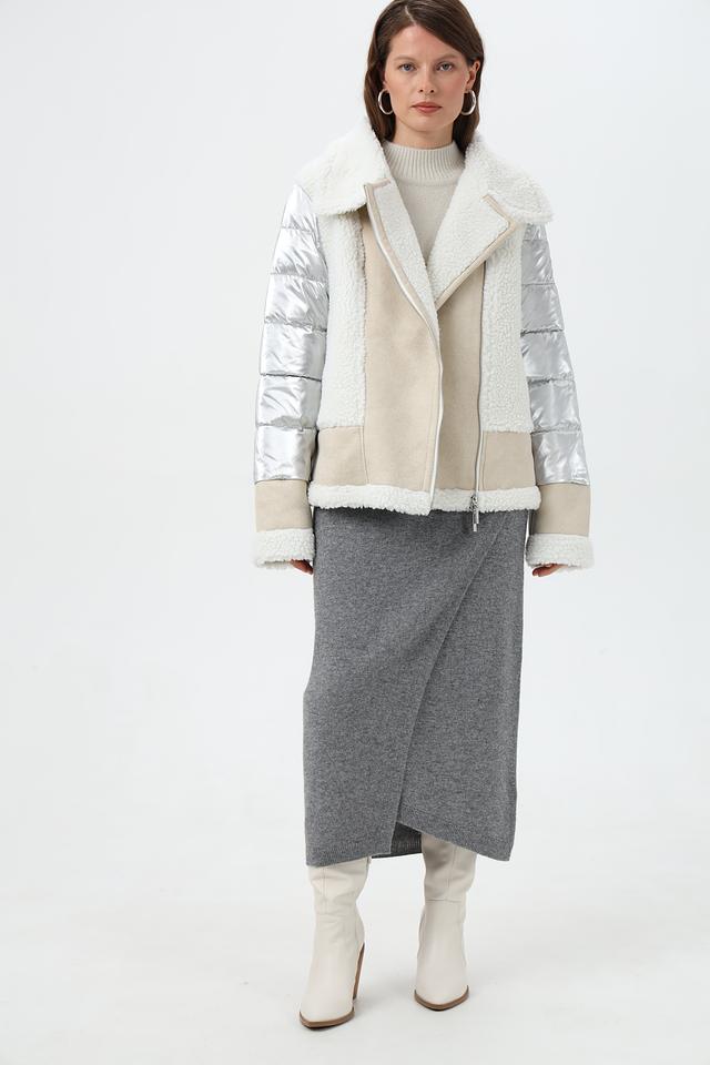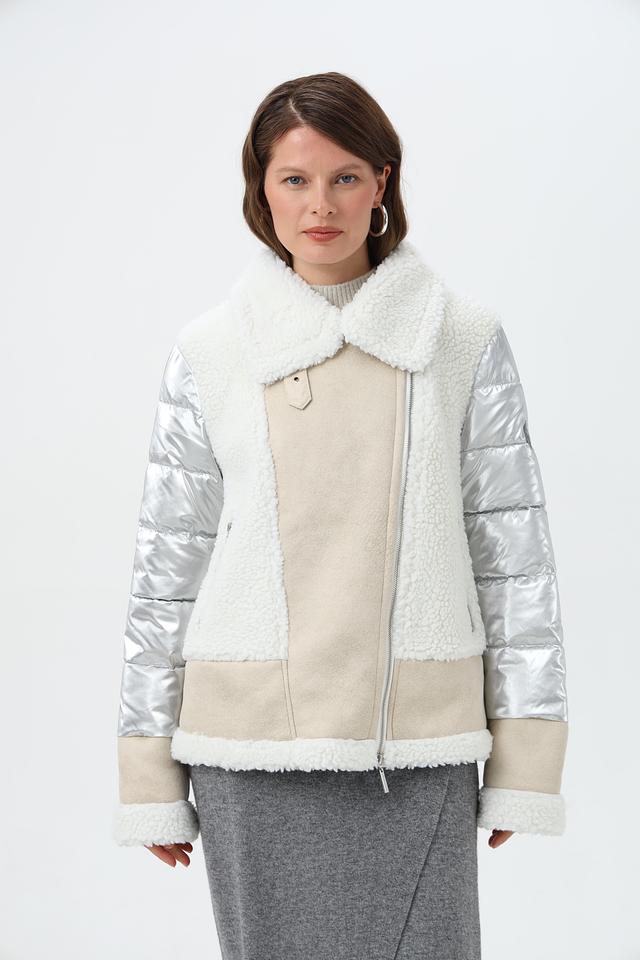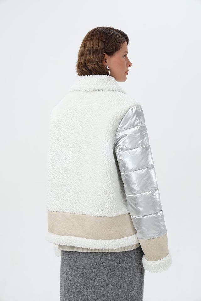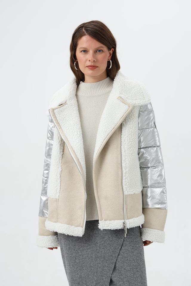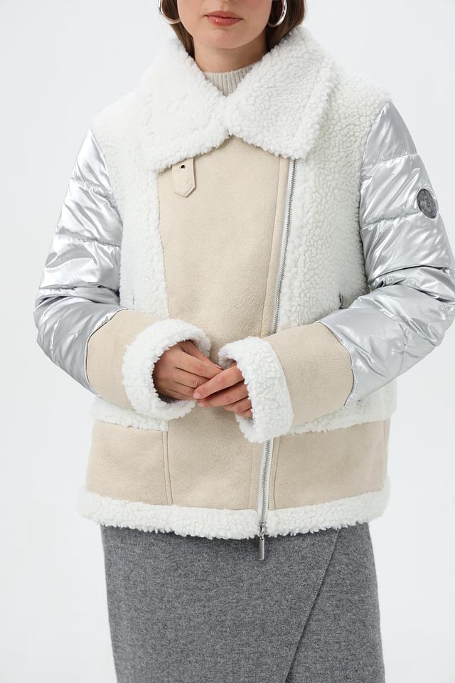 Куртка имеет комбинированный дизайн: центральная часть и воротник выполнены из мягкого бежевого искусственного меха, а рукава - из стеганого серебристого полиэстера. Застежка-молния по центру обеспечивает удобство ношения.