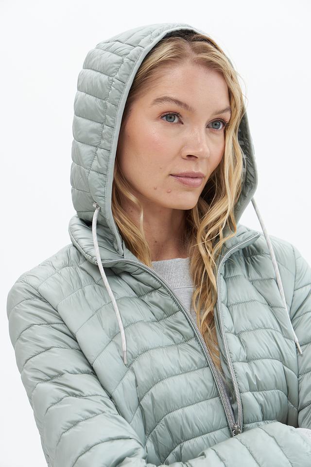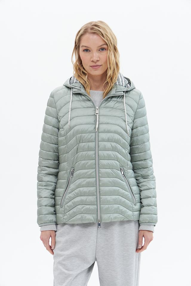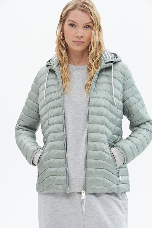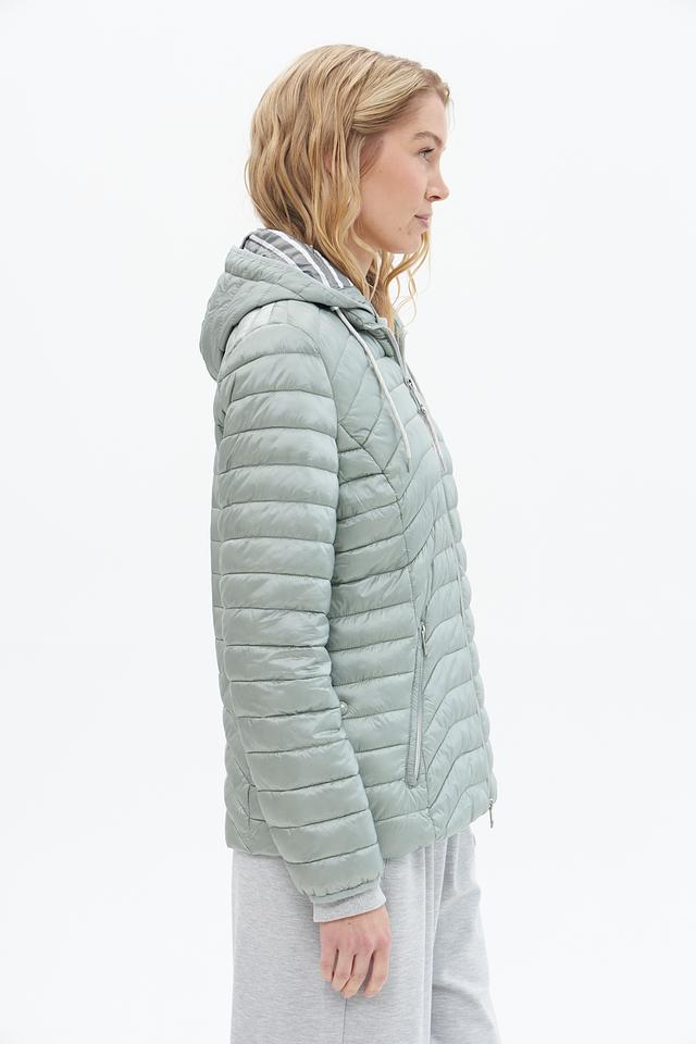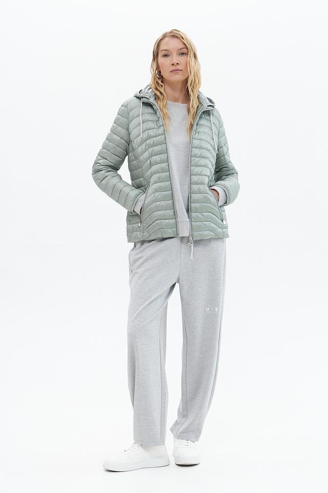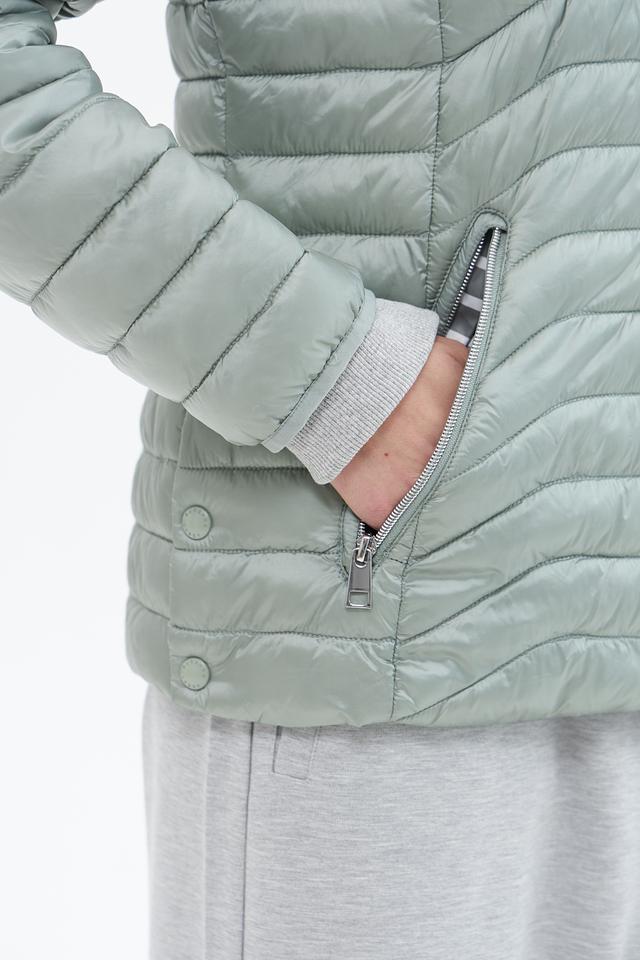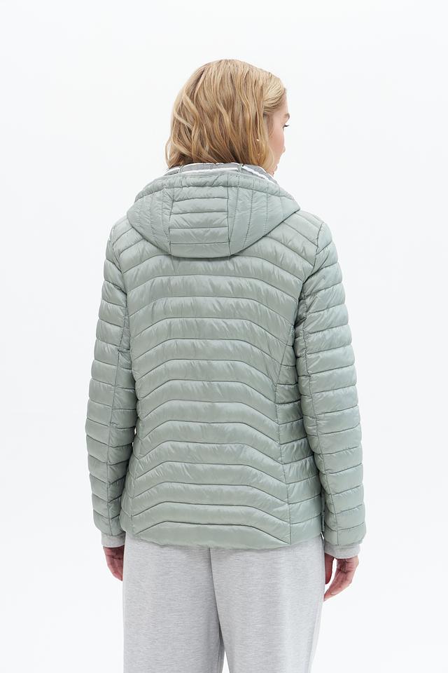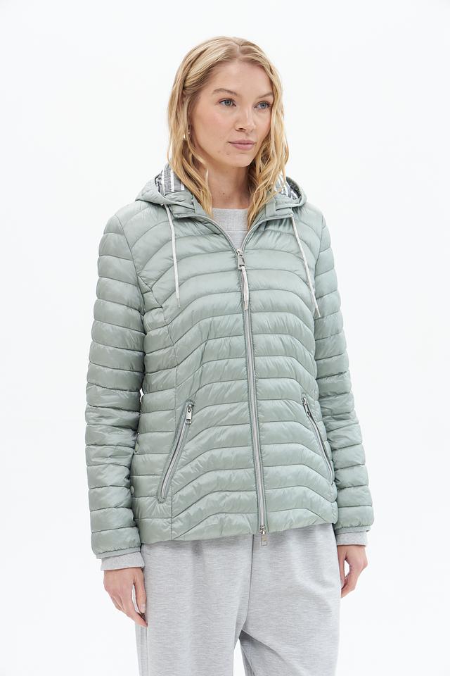 Куртка имеет стеганую фактуру, которая придает ей современный и модный вид. Оливковый цвет делает ее универсальной и легко сочетаемой с различными элементами одежды.