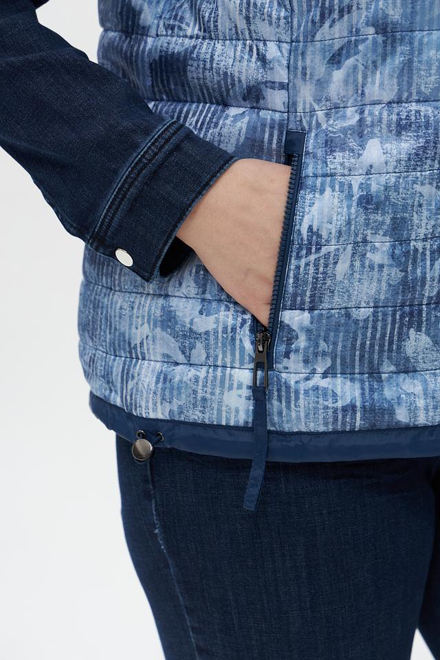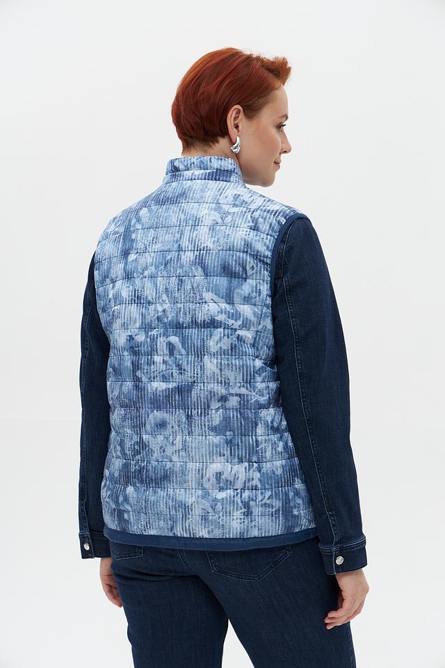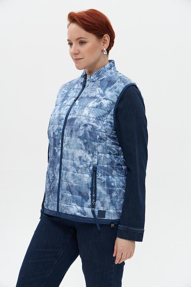 Жилет имеет стеганую фактуру с интересным цветочным принтом в синих тонах. Высокий воротник-стойка защищает от ветра, а застежка-молния позволяет легко регулировать посадку. Боковые карманы добавляют функциональности.