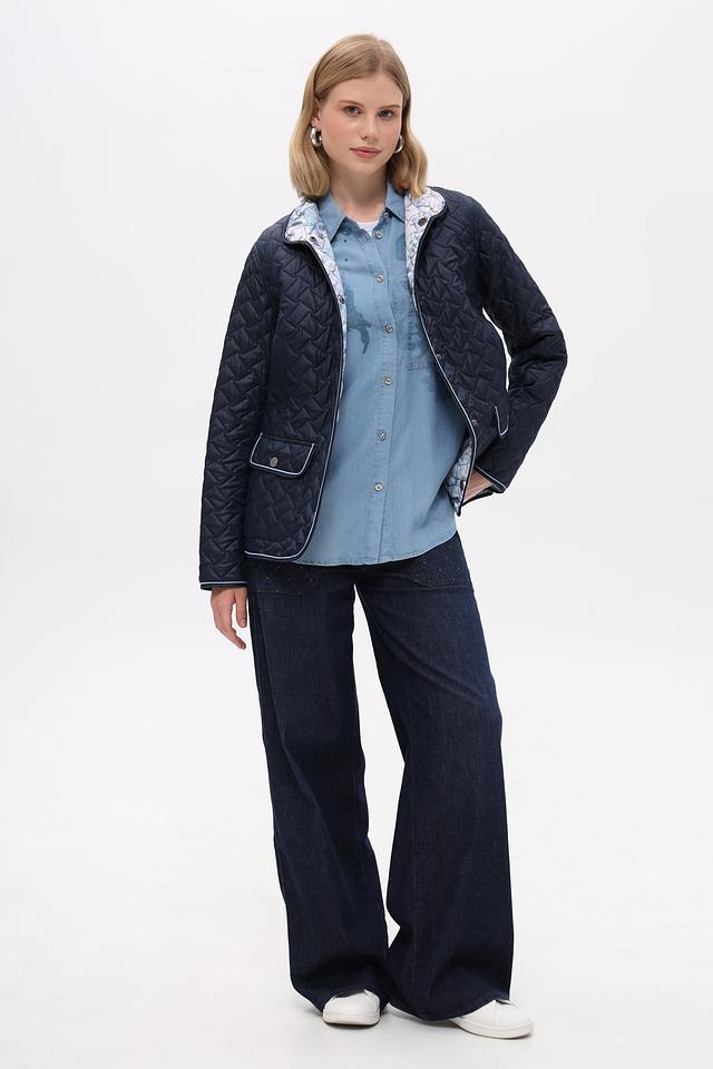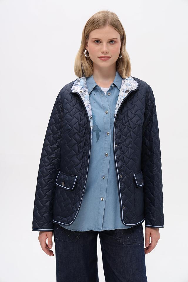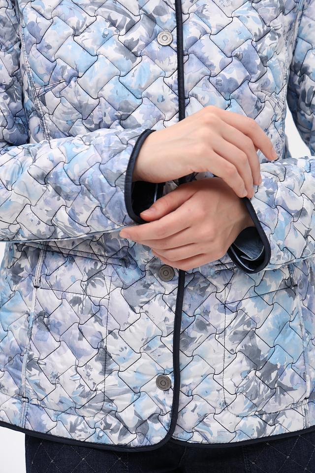 Модель застегивается на пуговицы по всей длине. Имеет два функциональных боковых кармана. Отличительной особенностью является стеганая фактура и подкладка с нежным цветочным принтом, добавляющим образу изысканность.