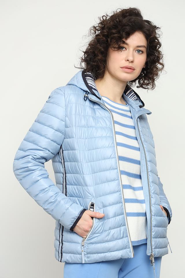 Дополнительный декор в виде тонких полос контрастного цвета на рукавах и капюшоне добавляет куртке изысканности. Приятная на ощупь ткань и качественный пошив гарантируют комфорт и долговечность изделия.