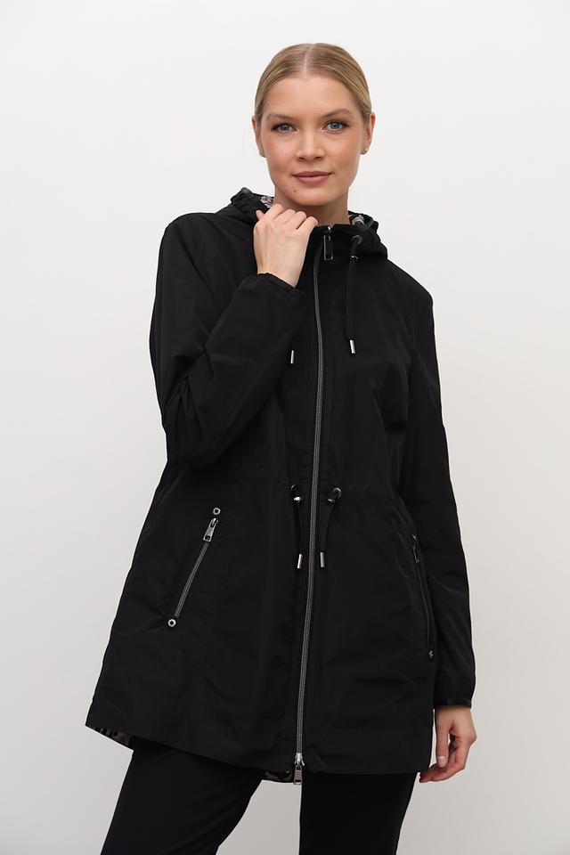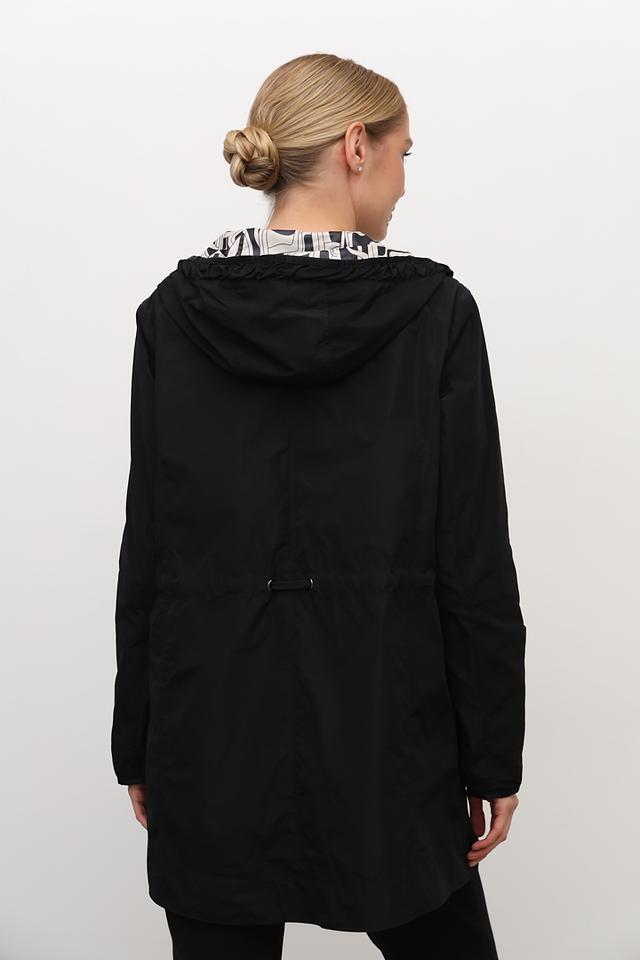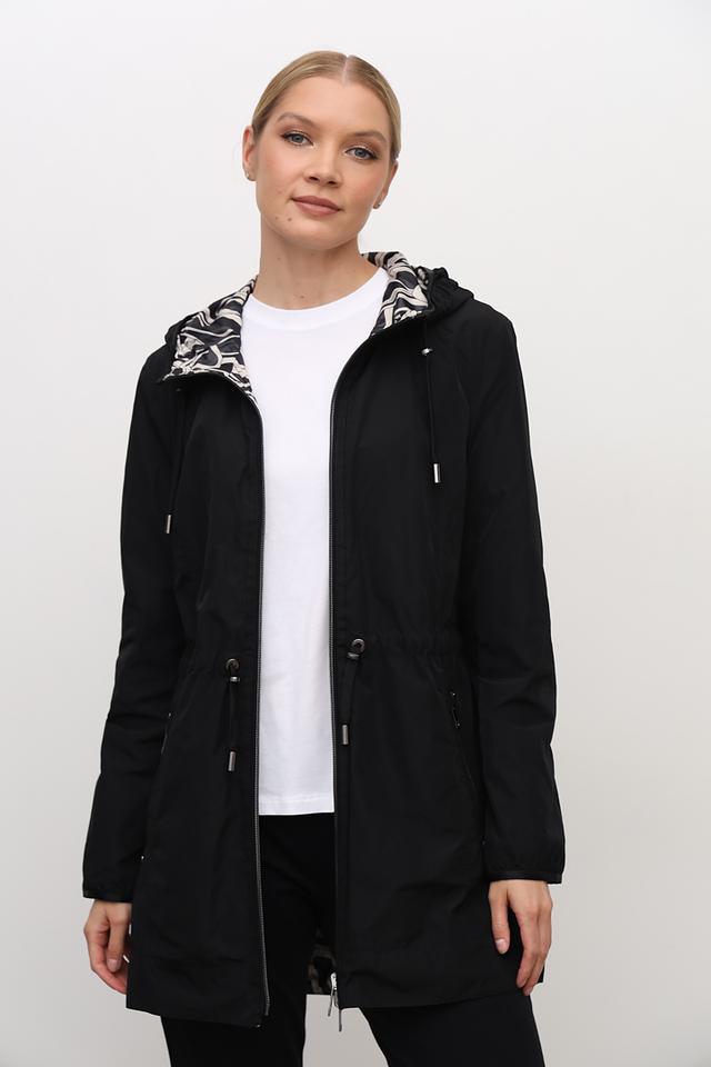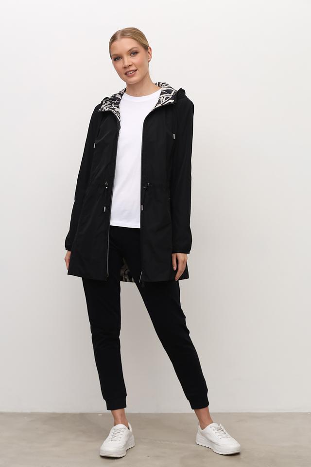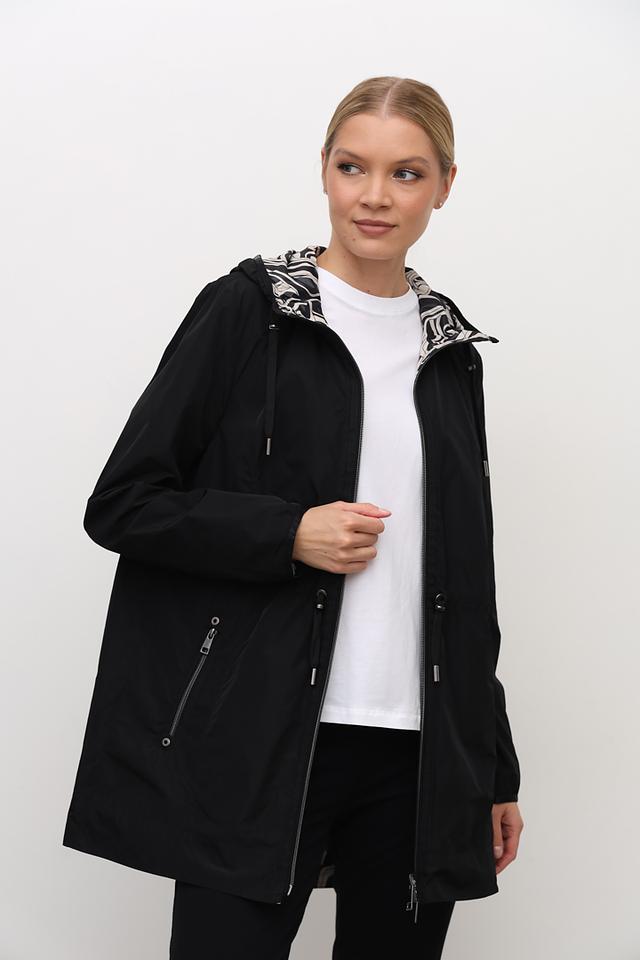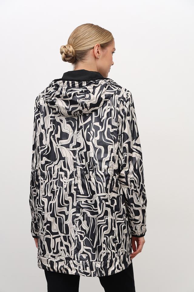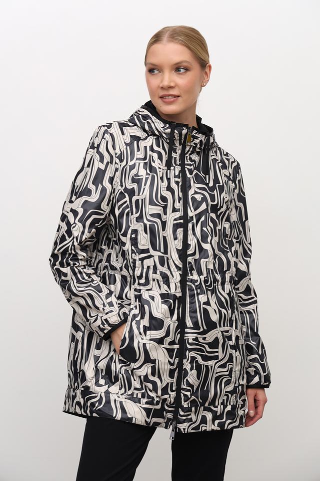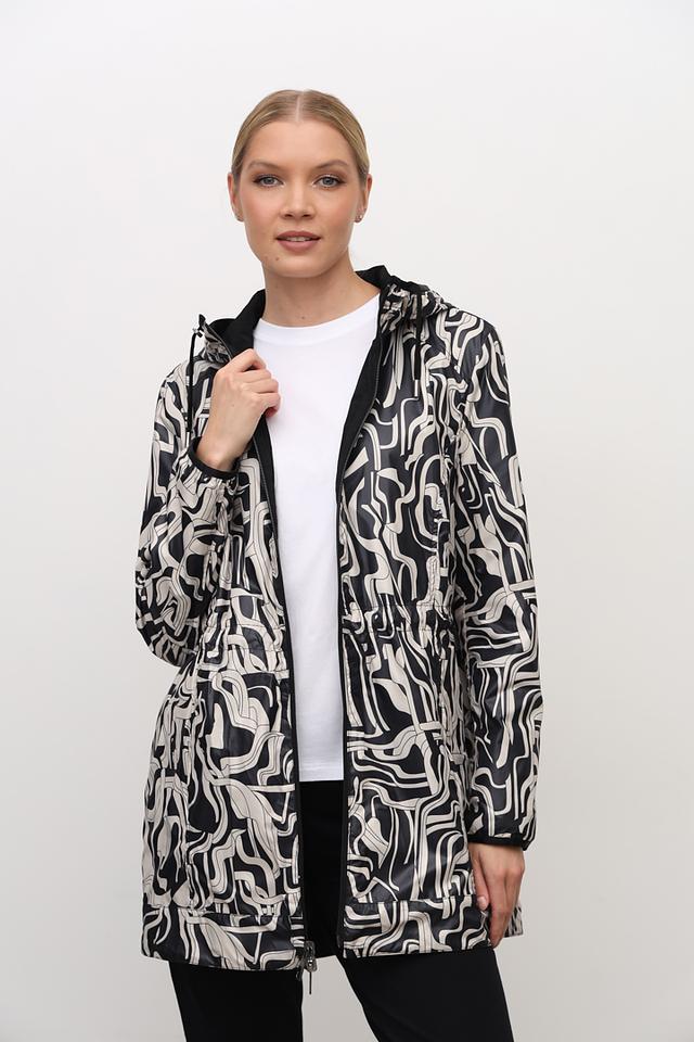 Плащ имеет удобный капюшон, который защитит вас от ветра и дождя, а пояс позволяет регулировать силуэт и подчеркнуть талию. Внутренняя часть капюшона выполнена с оригинальным принтом в чёрно-белой гамме, добавляя образу изюминку.
