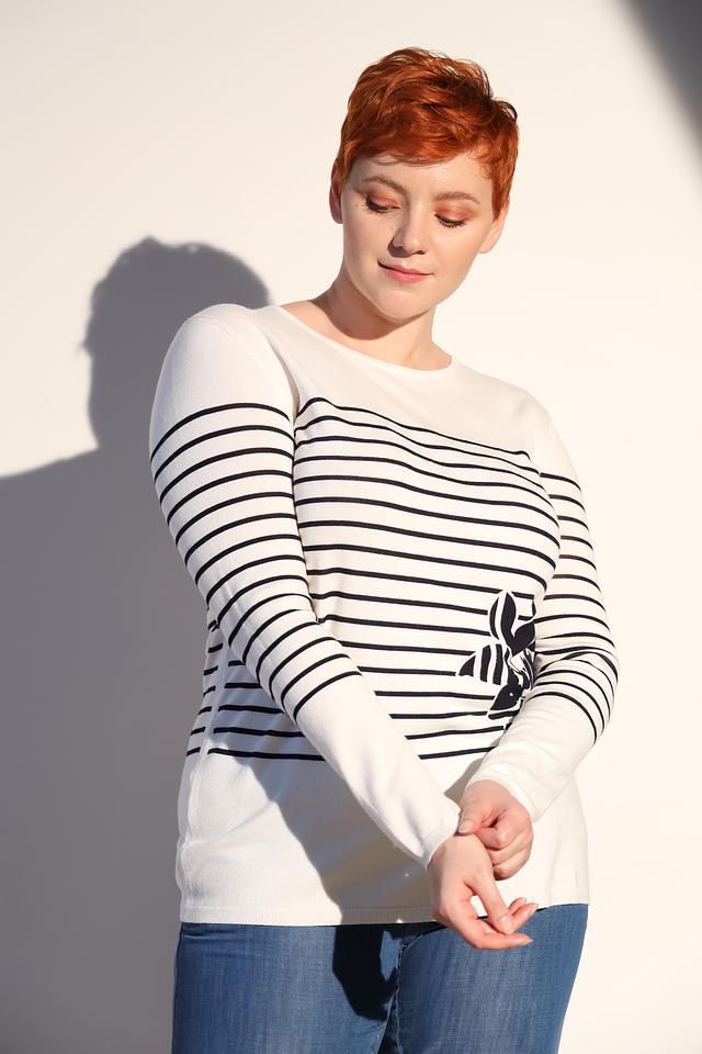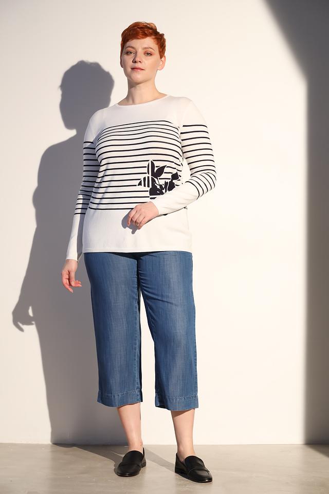 Женский пуловер Lebek белого цвета с черными полосками и оригинальным принтом. Изготовлен из мягкой вискозы с добавлением полиамида для сохранения формы. Стильный и комфортный выбор для повседневного гардероба. Состав: вискоза 70%, полиамид 30%