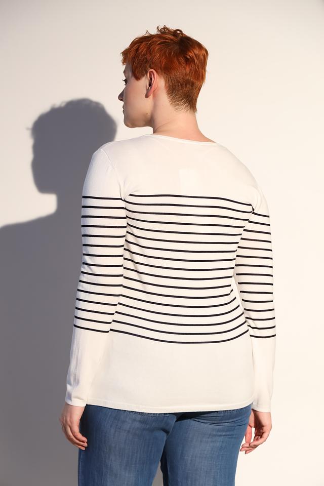 Этот стильный пуловер от Lebek станет прекрасным дополнением к вашему гардеробу. Пуловер выполнен в классической белой расцветке с черными горизонтальными полосками, что придает ему универсальность и легкость в сочетании с другими вещами.