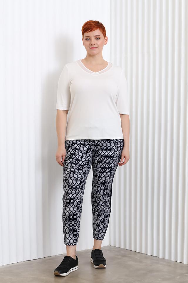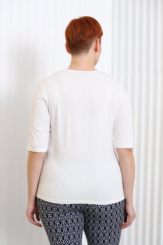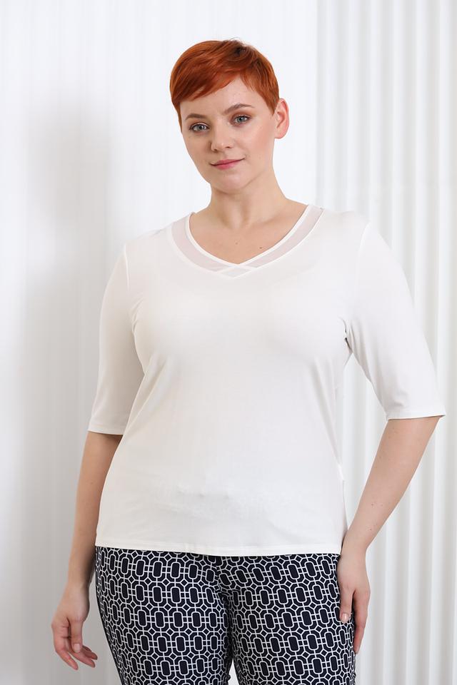 Модель имеет короткий рукав и свободный крой, обеспечивающий комфорт в носке. Особый акцент сделан на вырезе горловины, который украшен деликатной сетчатой вставкой, придающей блузе изысканность и женственность.