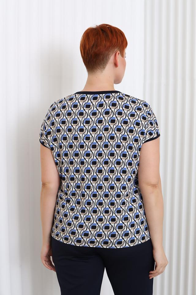 Особенностью данной модели является оригинальный геометрический принт в синих и бежевых тонах. V-образный вырез горловины и короткие рукава делают блузу легкой и воздушной. Окантовка горловины выполнена в тёмно-синем цвете.