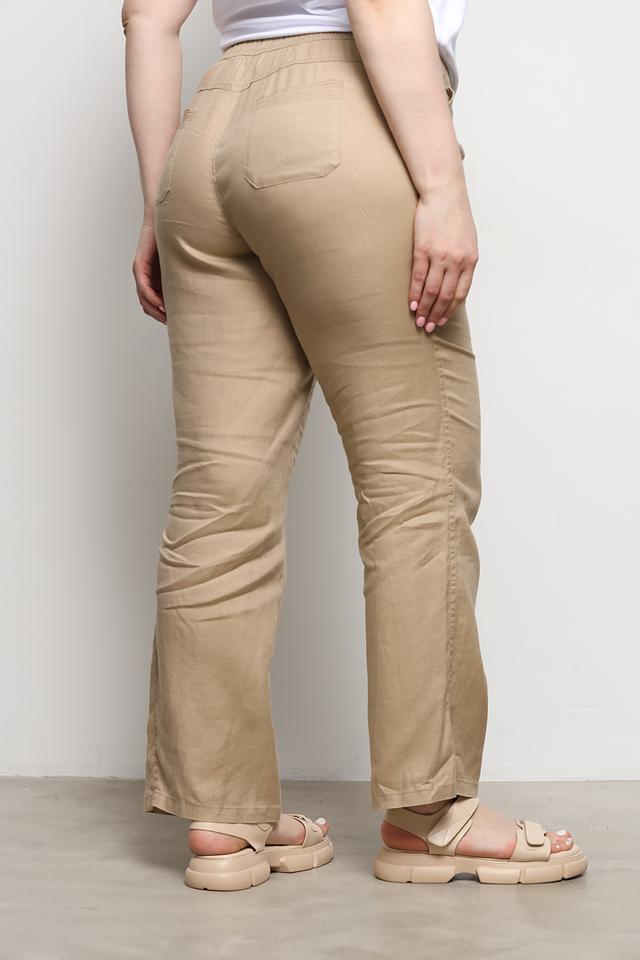 Брюки имеют прямой крой, который подходит для любой фигуры. Пояс на резинке с завязками обеспечивает удобную посадку и позволяет регулировать облегание. Классический бежевый цвет легко сочетается с различными элементами одежды, позволяя создавать разнообразные образы.