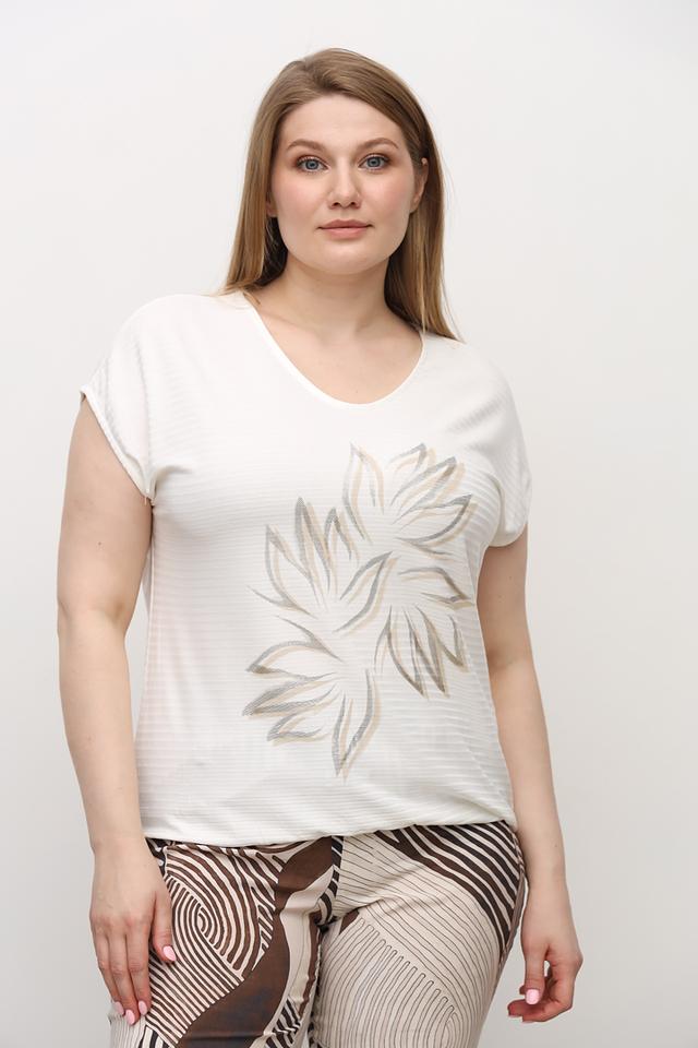Текстура ткани слегка ребристая, что придает футболке дополнительный объем и интересную фактуру. Состав: 95% вискоза, 5% эластан. Эта футболка идеально сочетается с джинсами, брюками или юбками, позволяя создавать разнообразные и стильные образы.