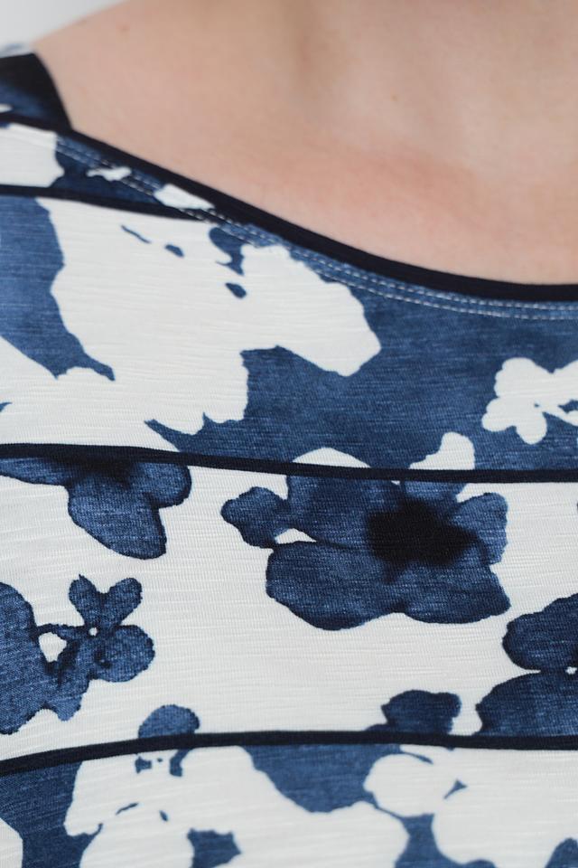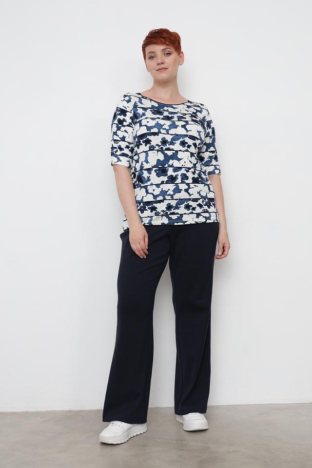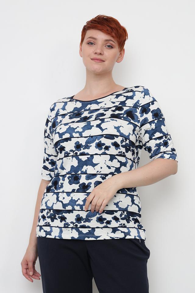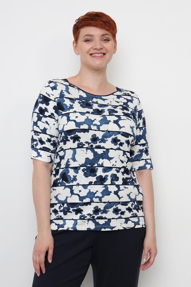 Основной цвет футболки – синий, а её поверхность украшен ярким цветочным принтом, который придает ей особую изысканность. Принт выполнен в виде абстрактных мазков, напоминающих акварельные рисунки. Футболка имеет округлый вырез горловины и короткие рукава, что делает её идеальной для теплой погоды.