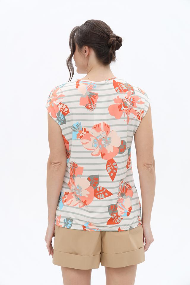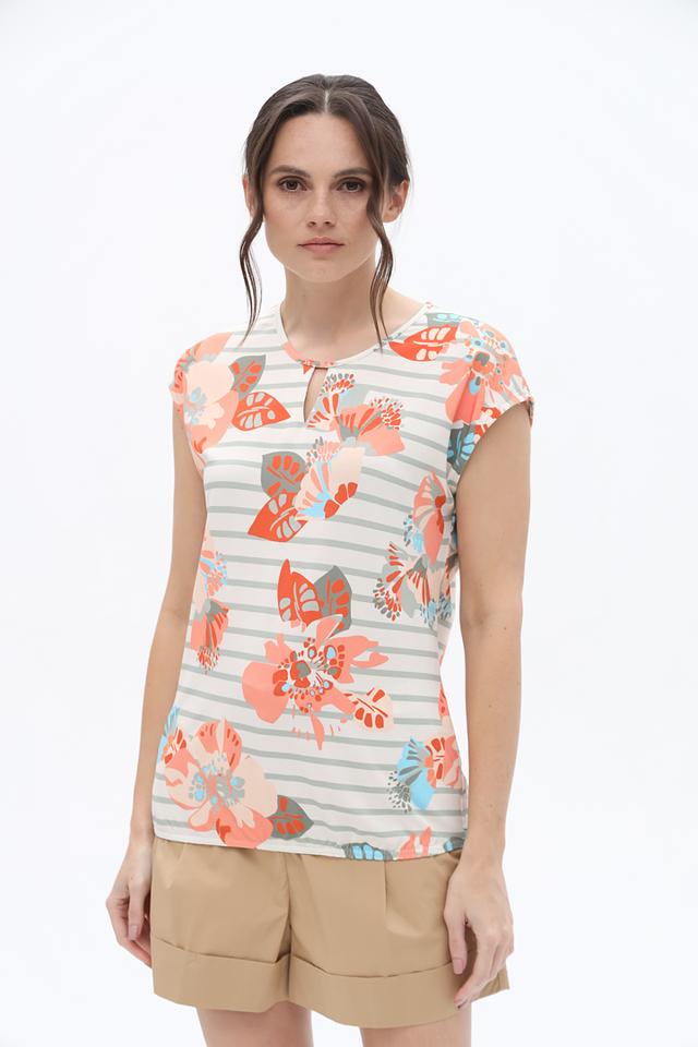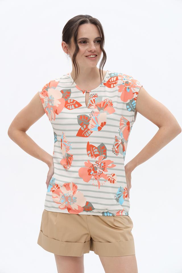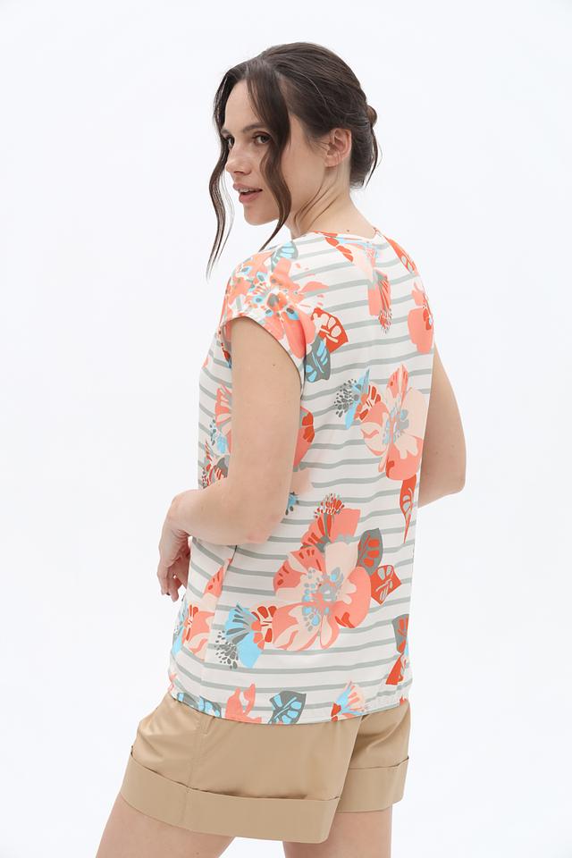 Женская футболка Lebek белого цвета с ярким цветочным принтом и короткими рукавами. Изготовлена из мягкой вискозы с добавлением эластана для комфорта и свободы движений. Идеальный выбор для создания летнего образа. Состав: вискоза 95%, эластан 5%