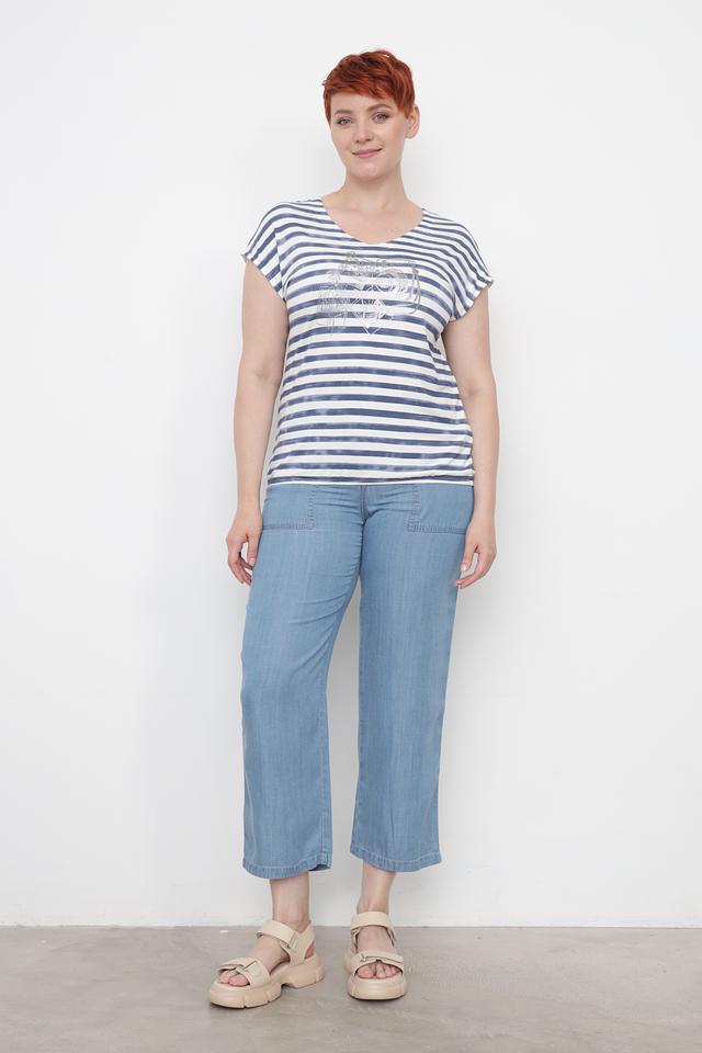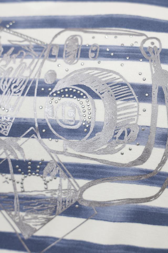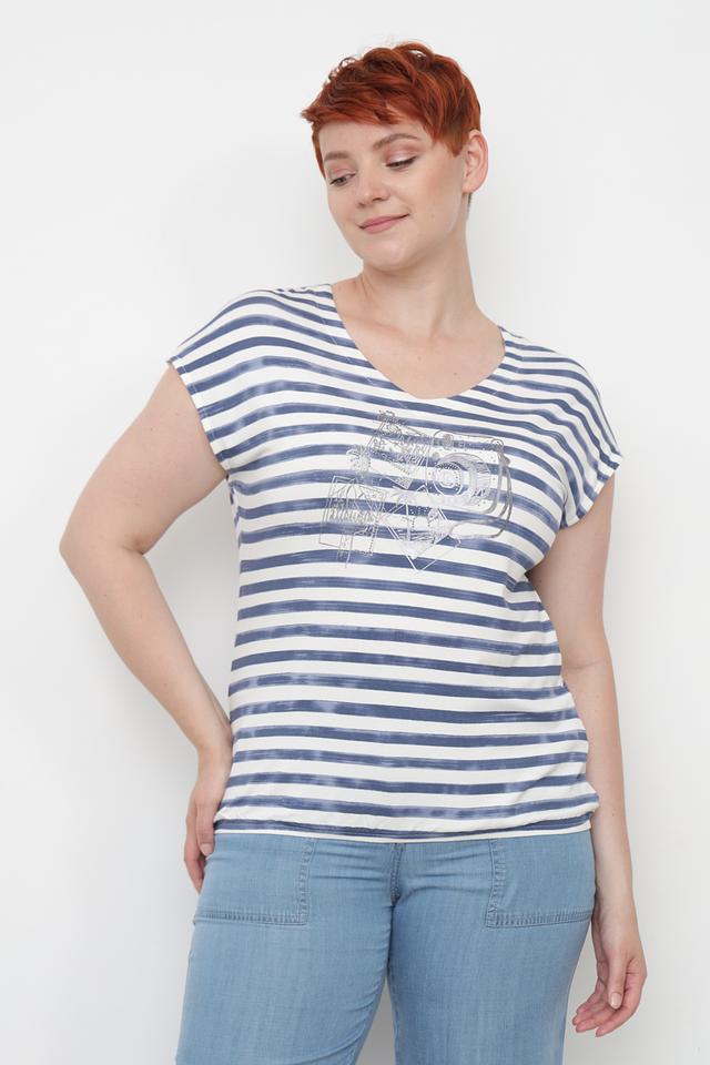 Женская футболка Lebek синего и белого цвета с ярким принтом. Модель выполнена из мягкой вискозы с добавлением эластана, обеспечивающего комфортную посадку. Футболка идеально подойдет для создания повседневных образов. Состав: вискоза 95%, эластан 5%