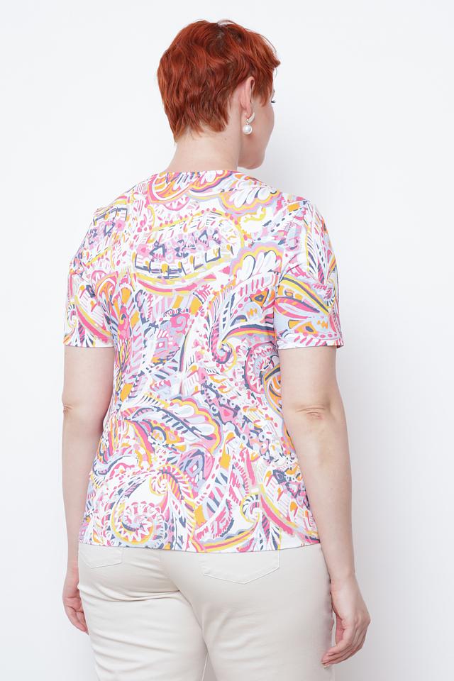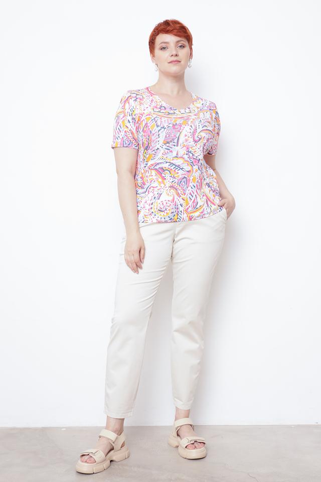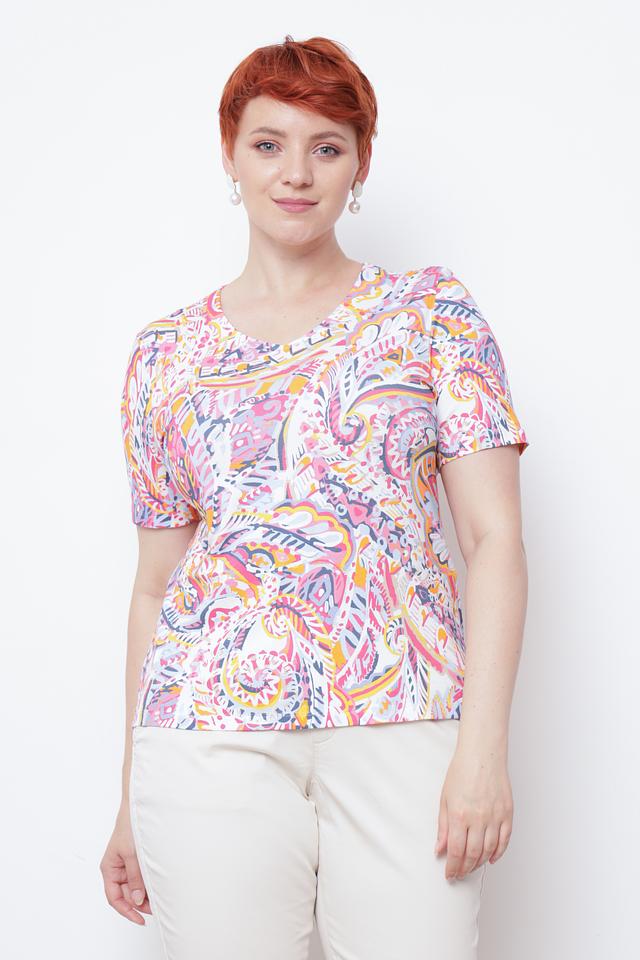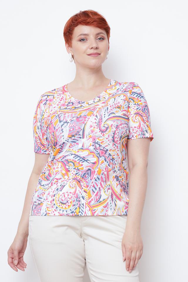 Футболка имеет прямой крой и короткие рукава, что делает ее универсальной для различных образов. Главная особенность модели – яркий и оригинальный принт, выполненный в абстрактном стиле. Цветовая гамма включает в себя оттенки розового, оранжевого, желтого, голубого и белого, создавая эффектный и запоминающийся образ.