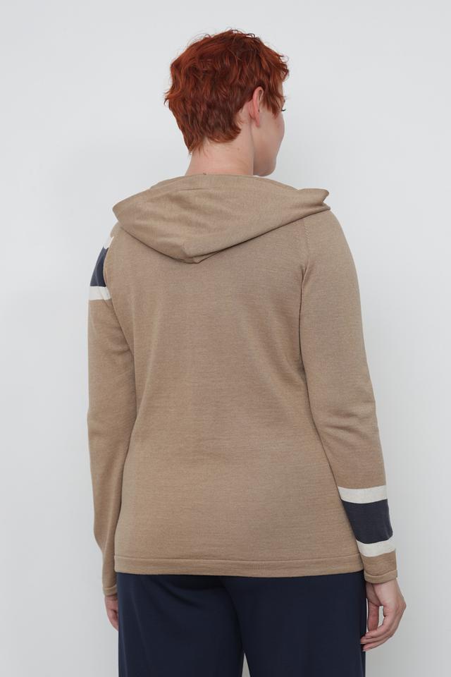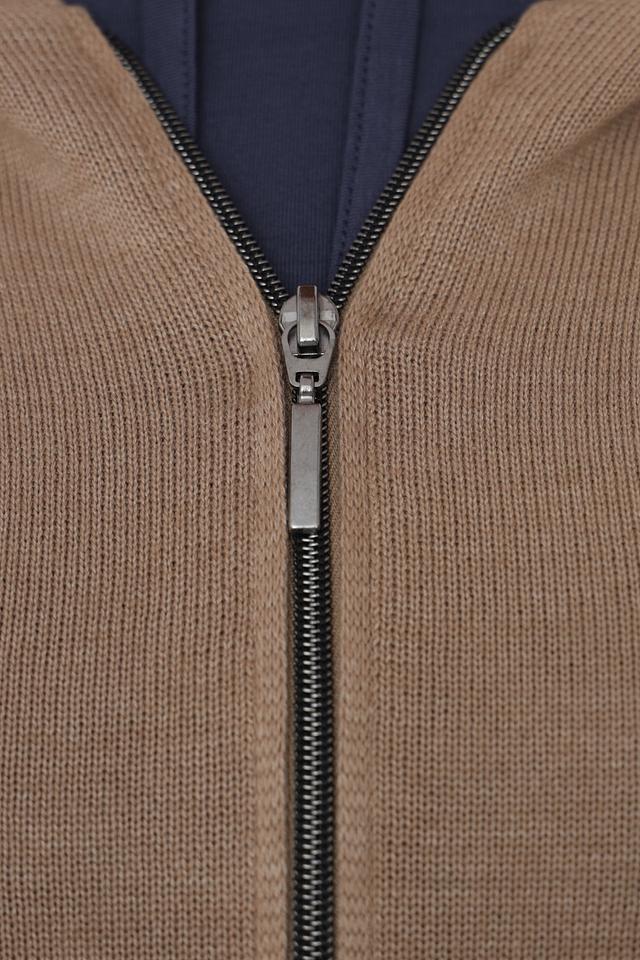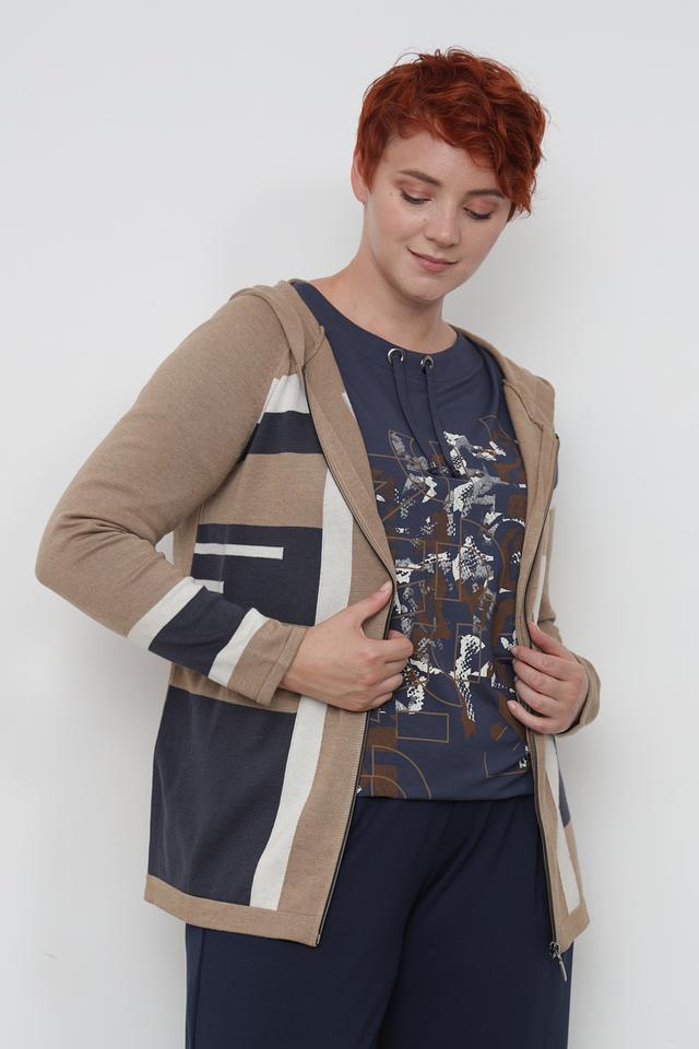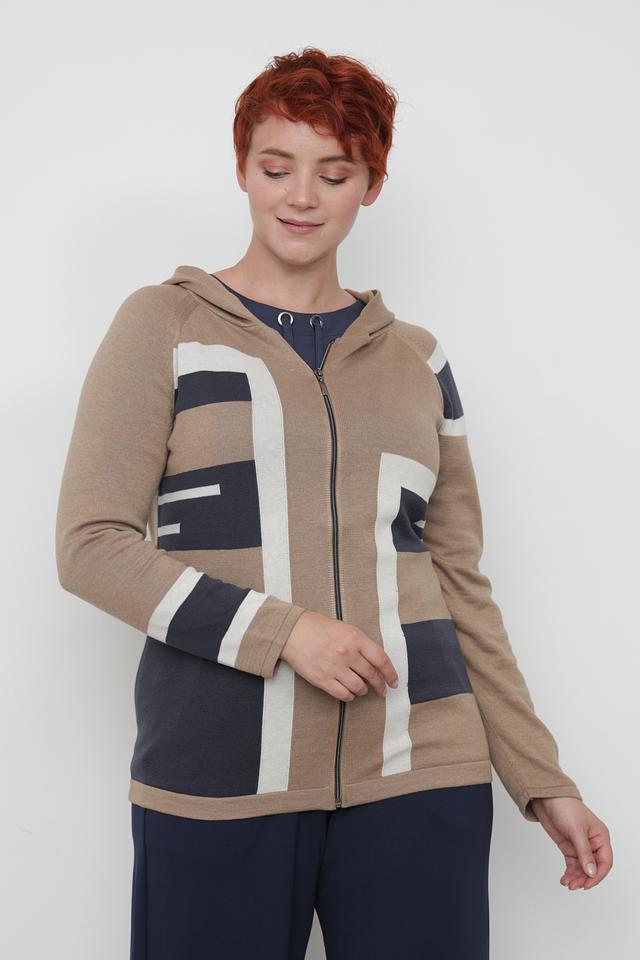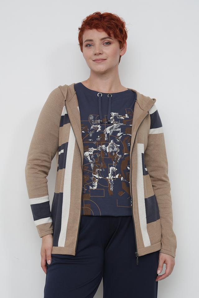 Бежевый жакет от Lebek с оригинальным дизайном в виде контрастных полос. Модель на молнии с капюшоном, выполнена из мягкого трикотажа, идеально подходит для создания повседневных образов. Состав: хлопок 50%, полиакрил 50%
