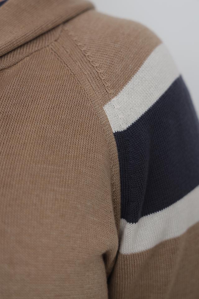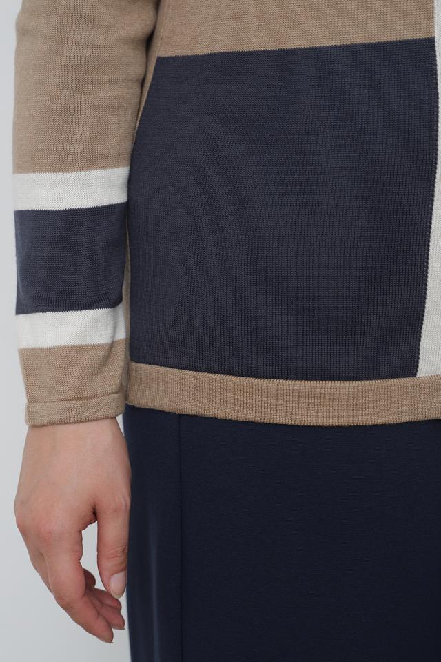 Этот стильный жакет от Lebek станет отличным дополнением к вашему гардеробу. Выполненный в бежевом цвете, он украшен контрастными полосами белого и тёмно-синего цветов, что придает ему современный и динамичный вид.