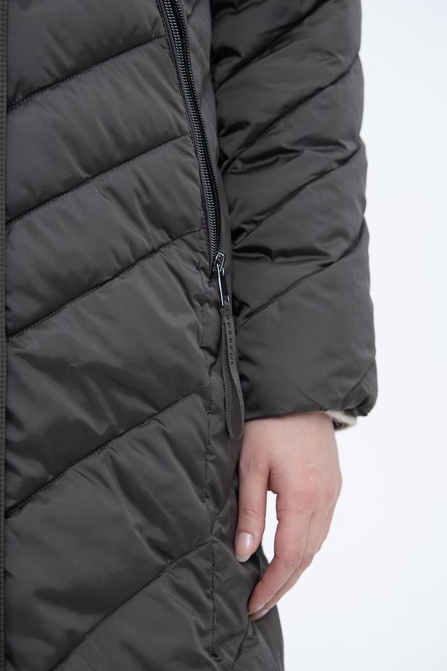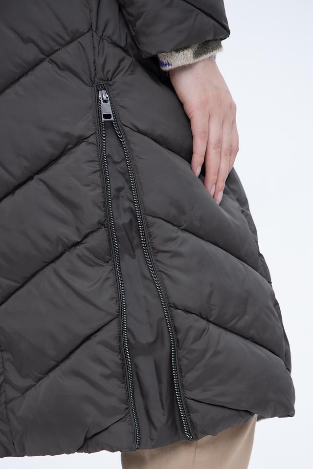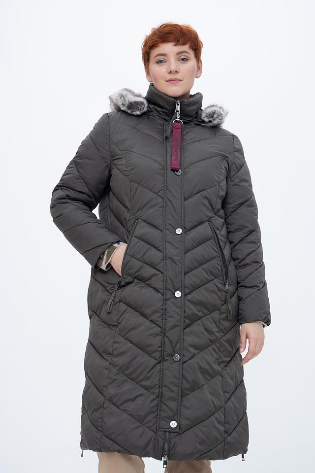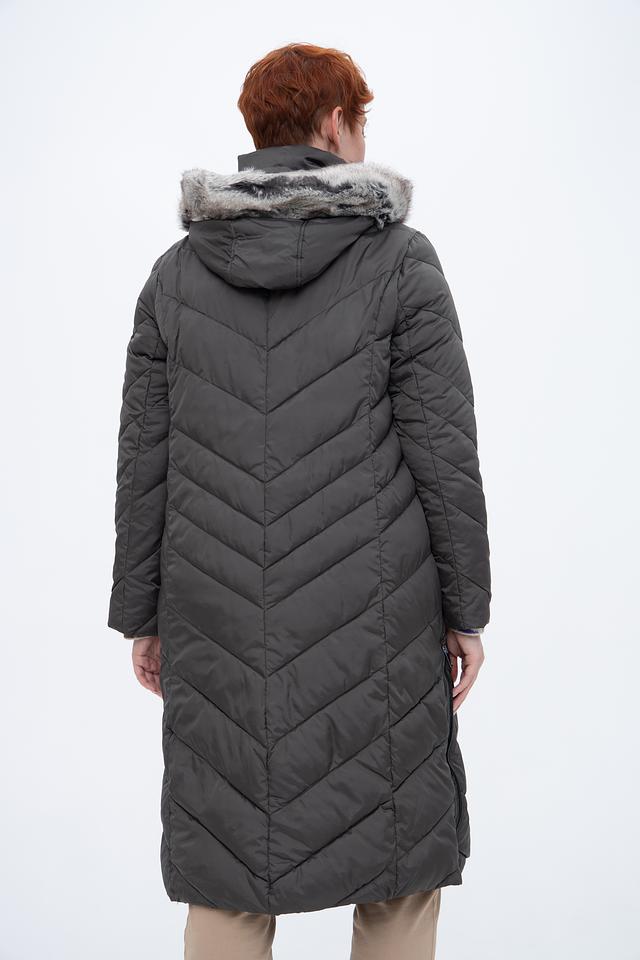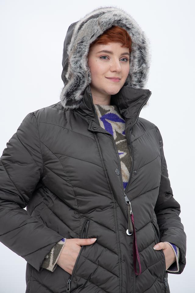 Пальто имеет стеганую фактуру, которая придает ему современный вид. Капюшон отделан искусственным мехом, что делает его не только функциональным, но и декоративным элементом. Застежка – молния, дополненная ветрозащитной планкой на кнопках.