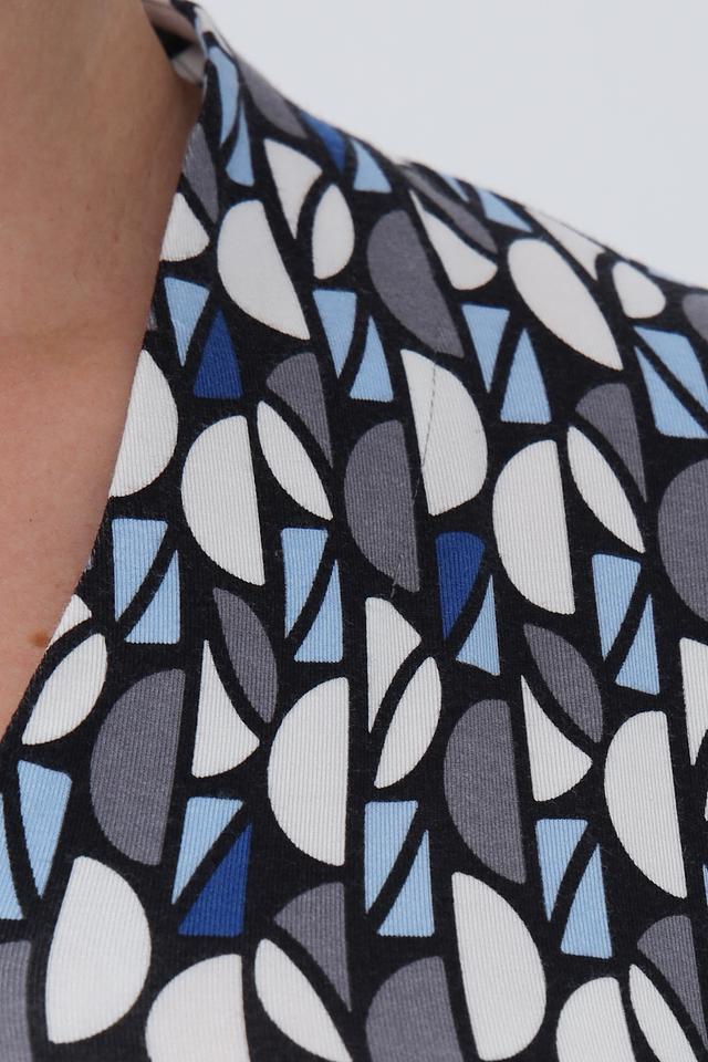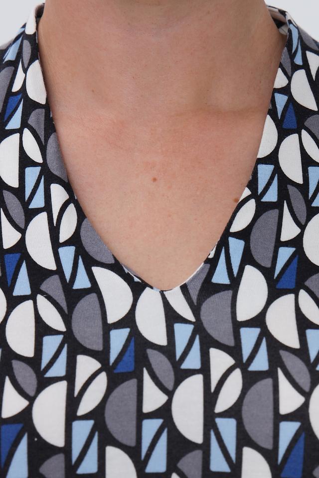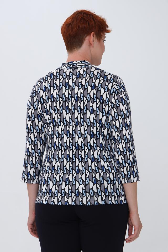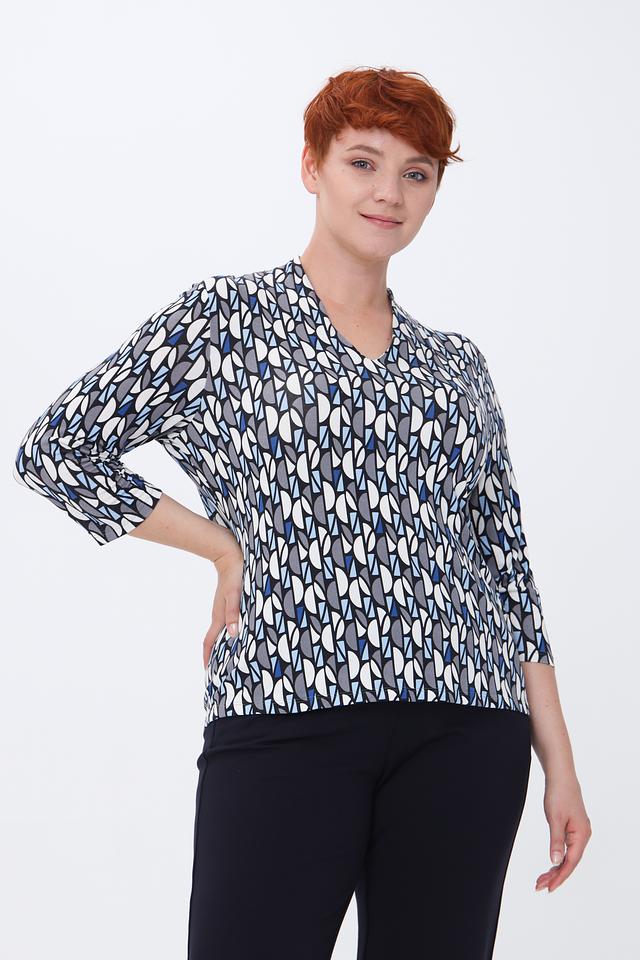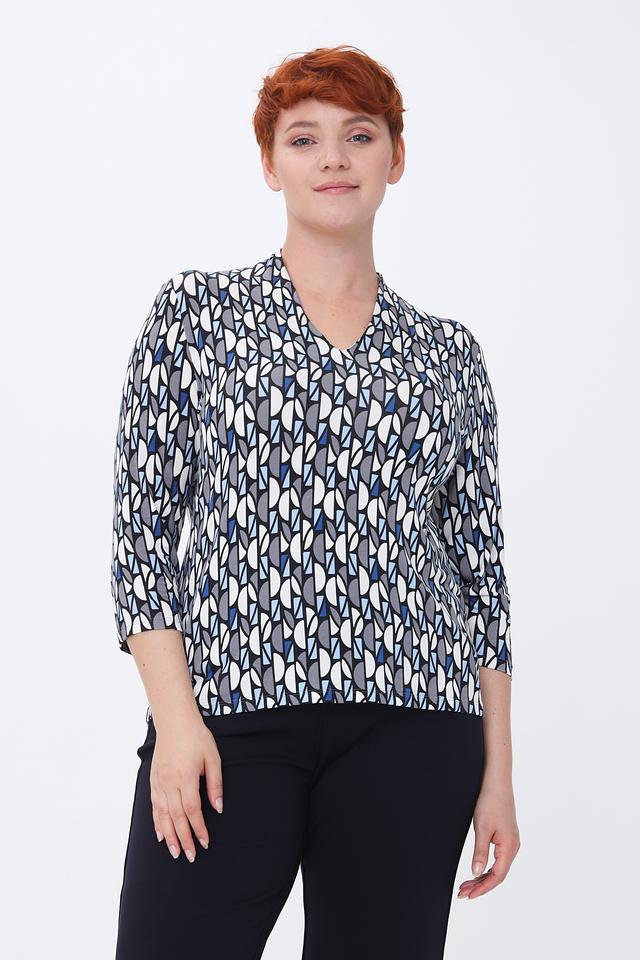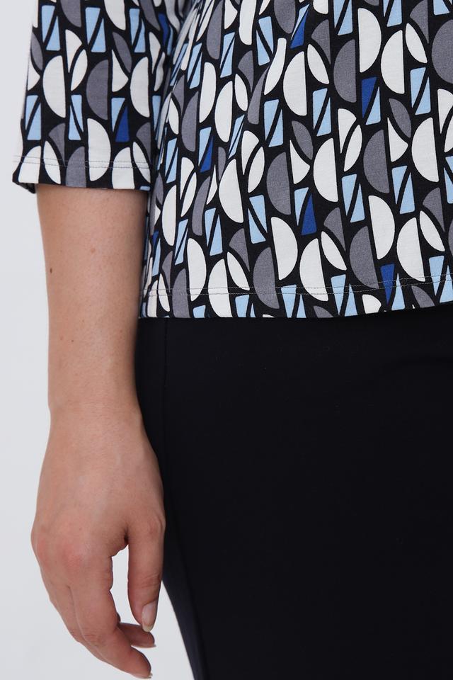 Блуза имеет V-образный вырез горловины и рукава длиной 3/4, что делает ее универсальной для различных образов. Особенностью данной модели является яркий геометрический принт, выполненный в сочетании синих, серых и белых оттенков.