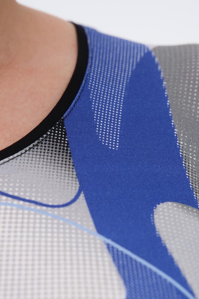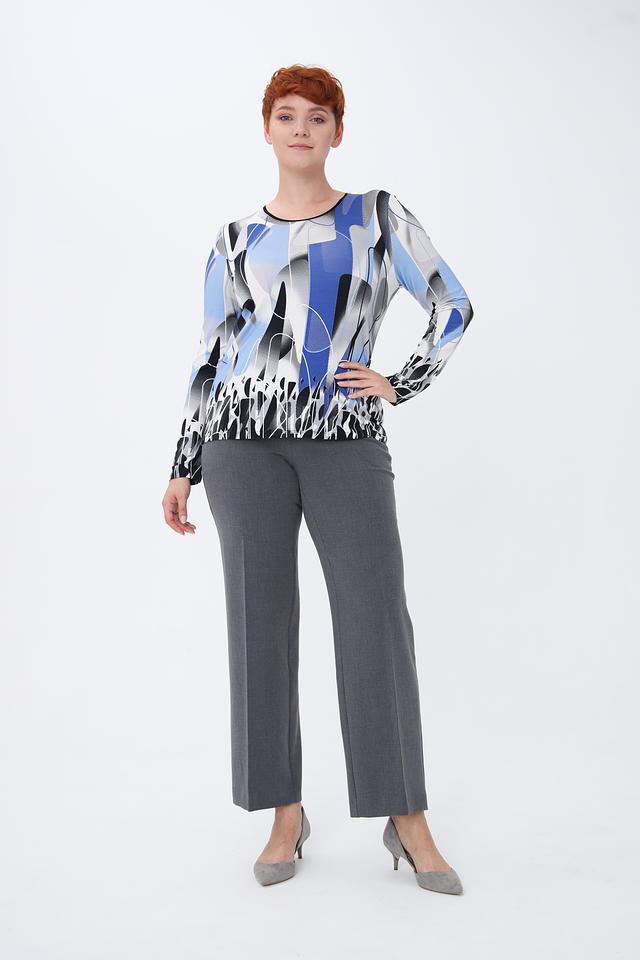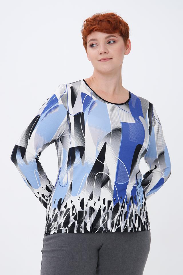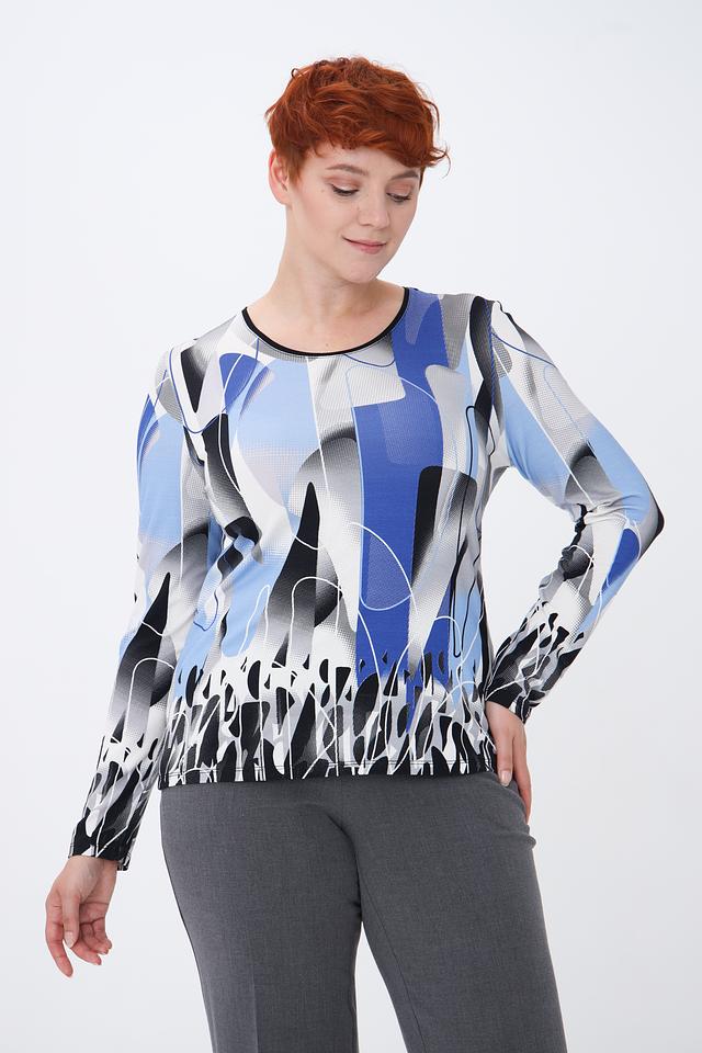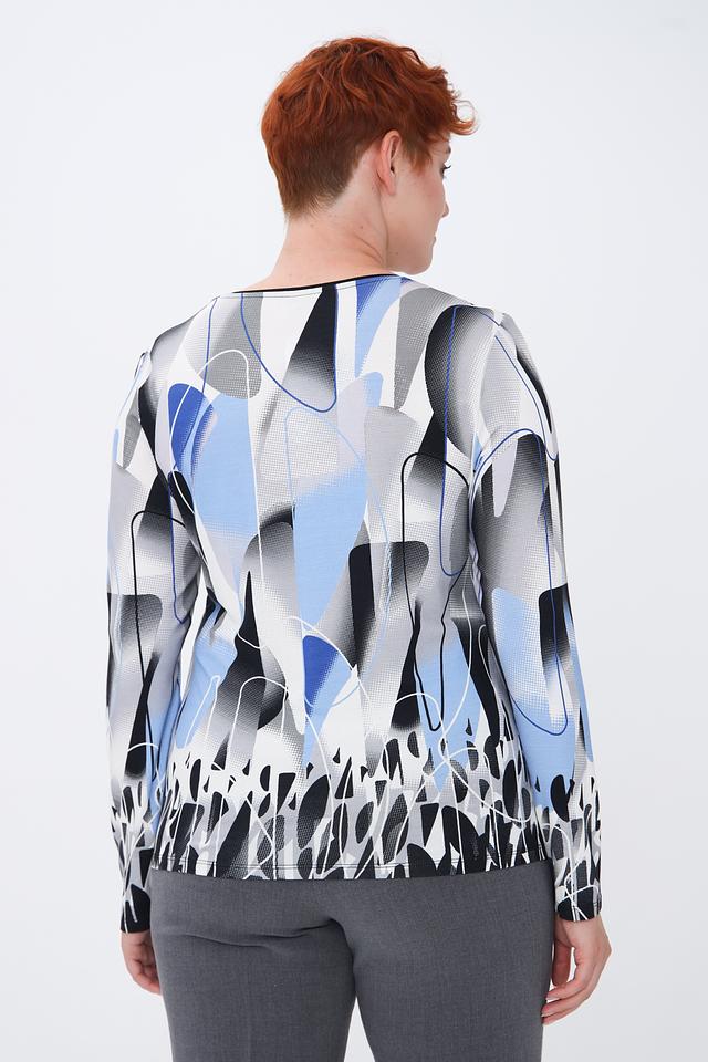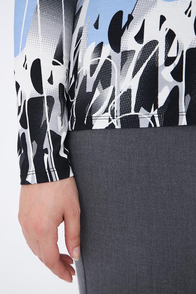 Модель имеет длинные рукава и круглый вырез горловины. Главная особенность – яркий и необычный абстрактный принт, сочетающий в себе оттенки голубого, серого, белого и черного.