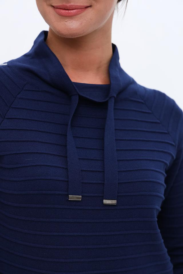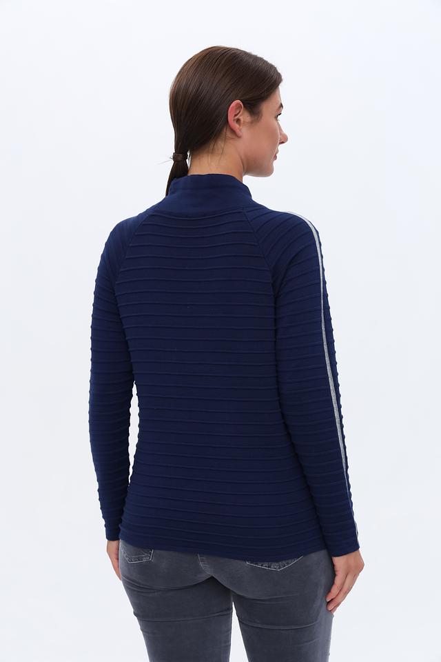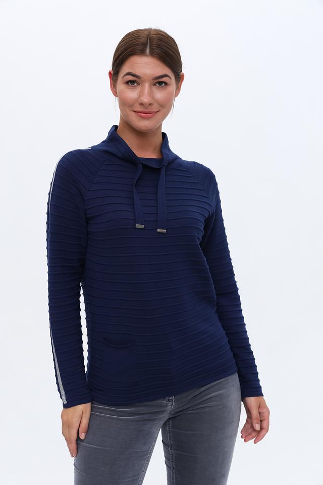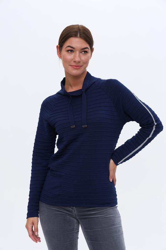 Синий пуловер от Lebek с воротником-стойкой и декоративными шнурками. Изготовлен из мягкого трикотажа с вертикальной текстурой и контрастными полосками на рукавах, станет стильным дополнением к вашему гардеробу. Состав: полиакрил 45%, хлопок 45%, полиамид 10%